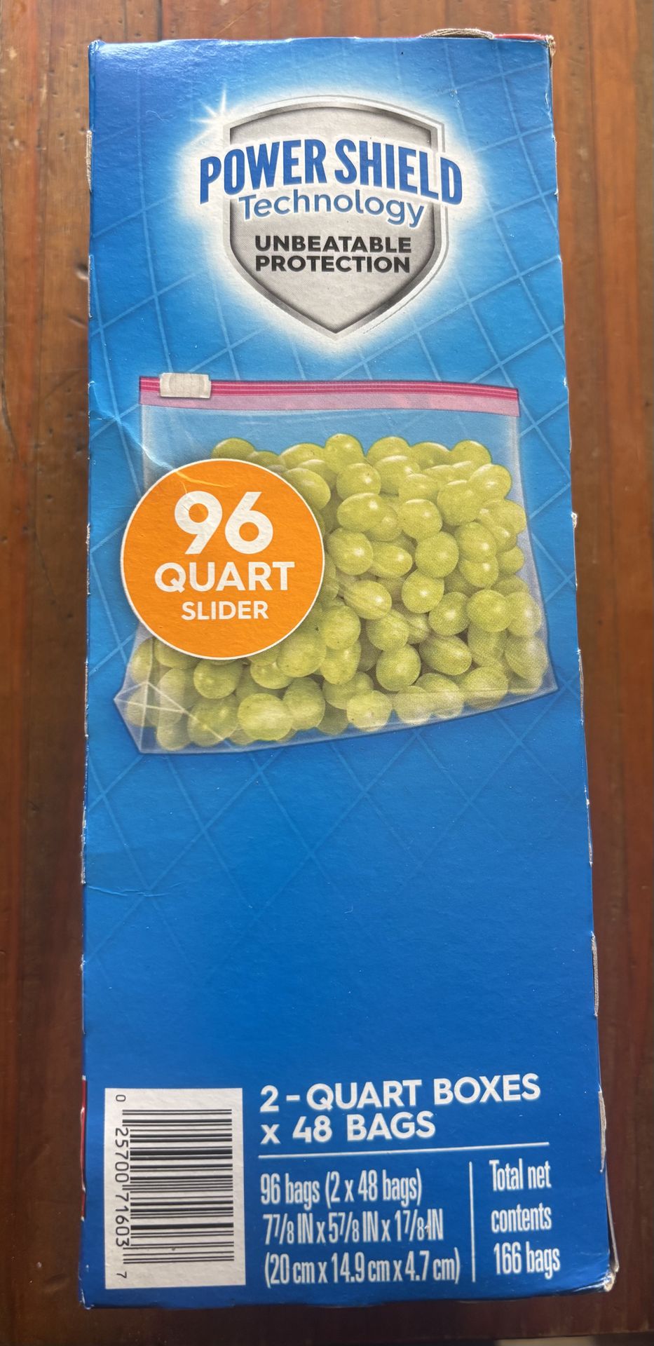 New box of Power Shield quart slider bags. Has 48 bags total. Great for food storage or organizing stuff. Power Shield Technology for unbeatable protection.