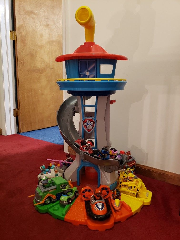 Like new Paw Patrol Lookout Tower with 9 large vehicles with characters, 6 smaller vehicles with characters, extra Marshall figurine, Robodog figurine and 6 holographic collector cards. All characters and vehicles pictured are included.