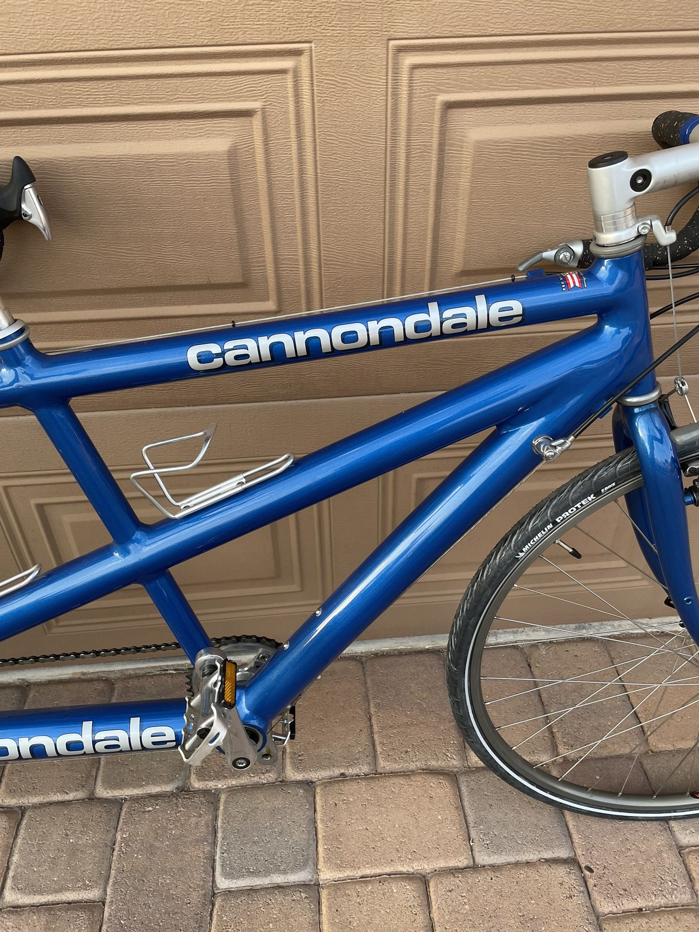 $795 Canondale Tandem Perfect condition almost like new! Beautiful Medal-Flake Blue Pearl Rear seat has a shock absorber seat post and very comfortable cushion seat. New tires, New Tube and research m tape!! New handlebar tape Very fast tandem you will love everything about it!! Size: 23/19 Location: CASA GRANDE, AZ. (NOT ELEVEN MILE)