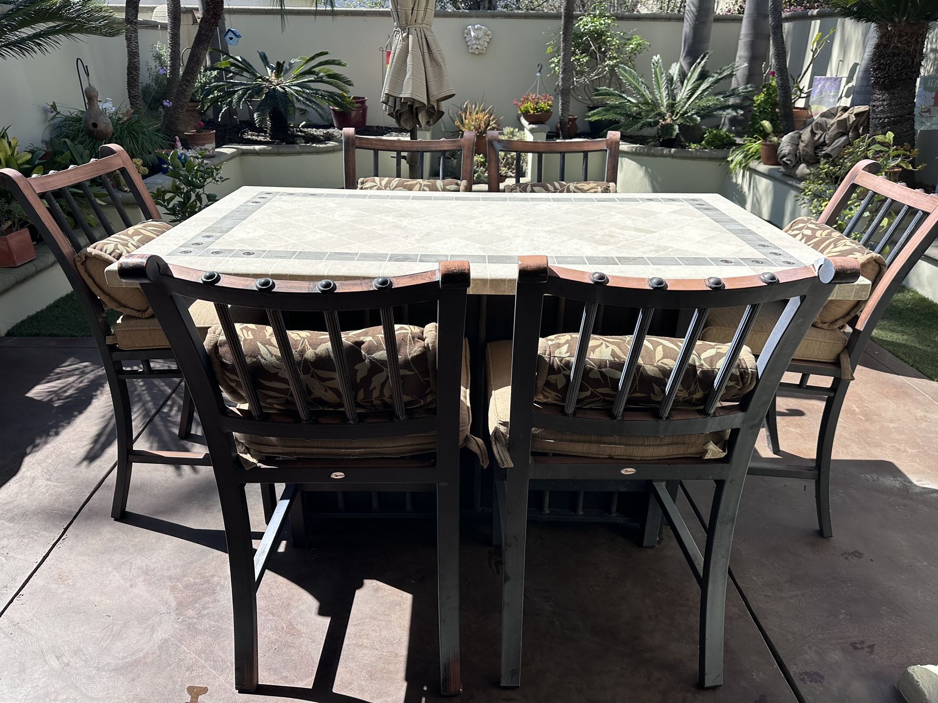 Beautiful stone top patio table with rectangular metal base, which provides storage for all seat and back cushions. Includes six (6) sturdy metal chairs. This is a well made table and chair set.