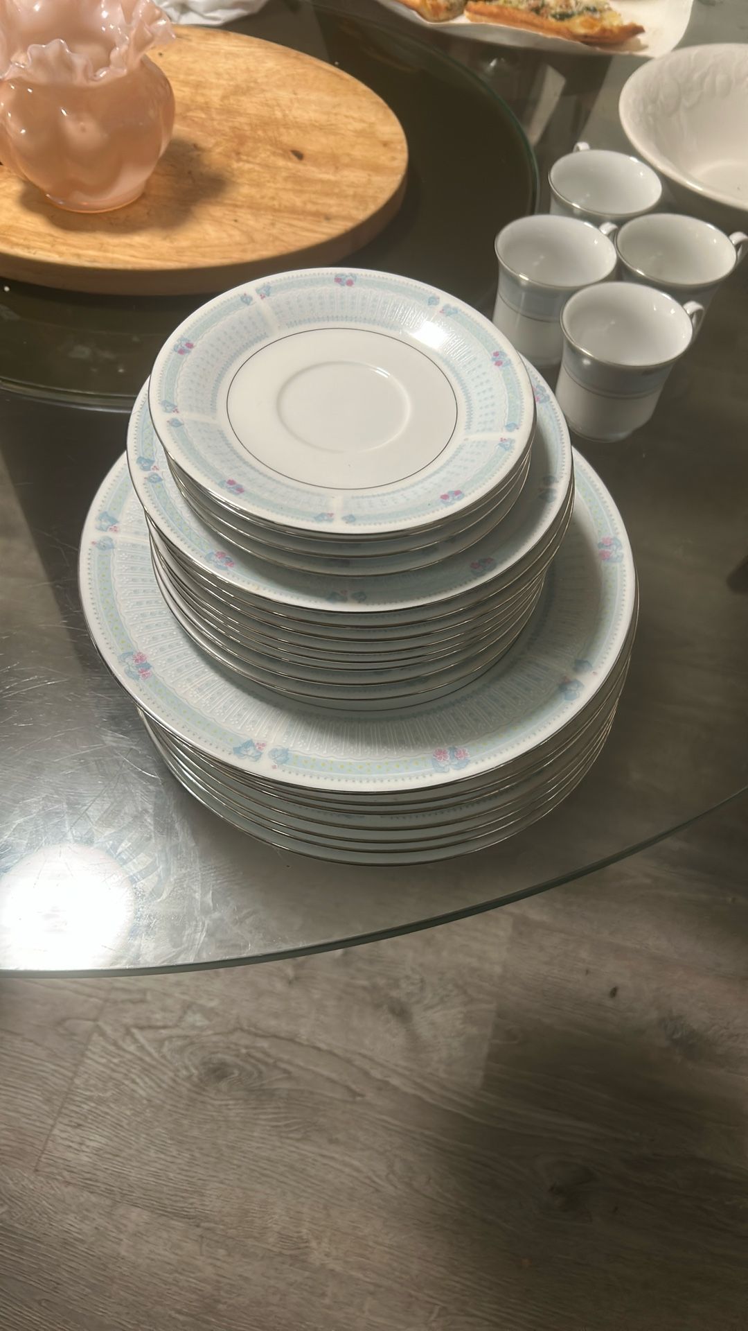 8 dinner plates, 8 medium plates and 8 small plates, 8 bowls one chip, 4 tea cups one chip