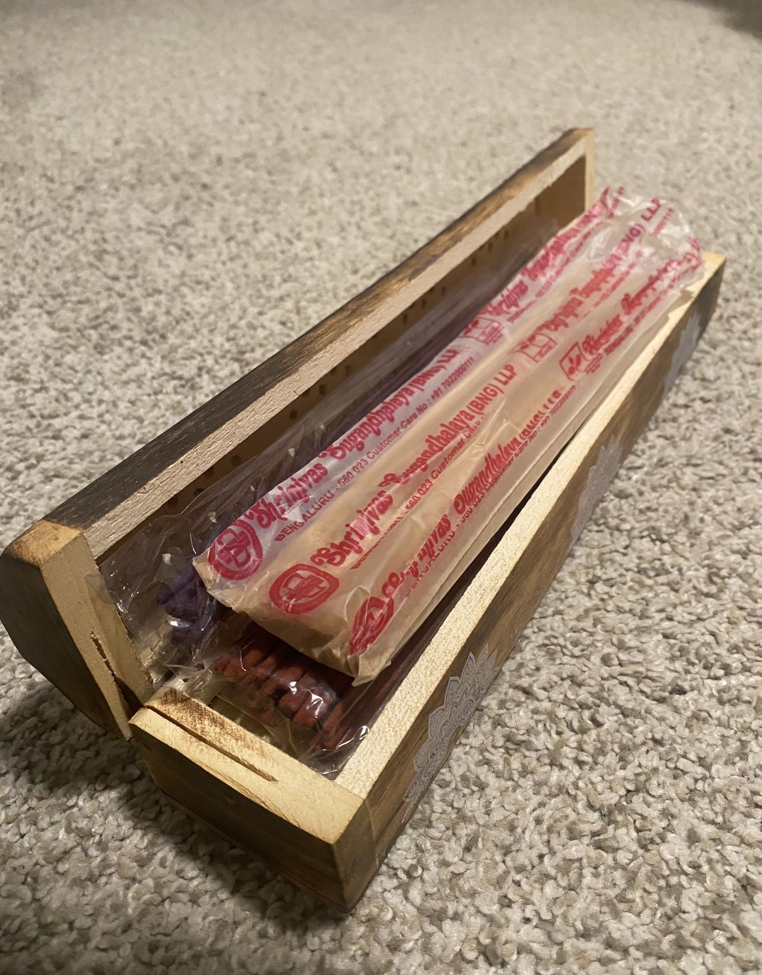 Incense holder storage with a pack of Nag Champa incense and 2 other incense packs also.