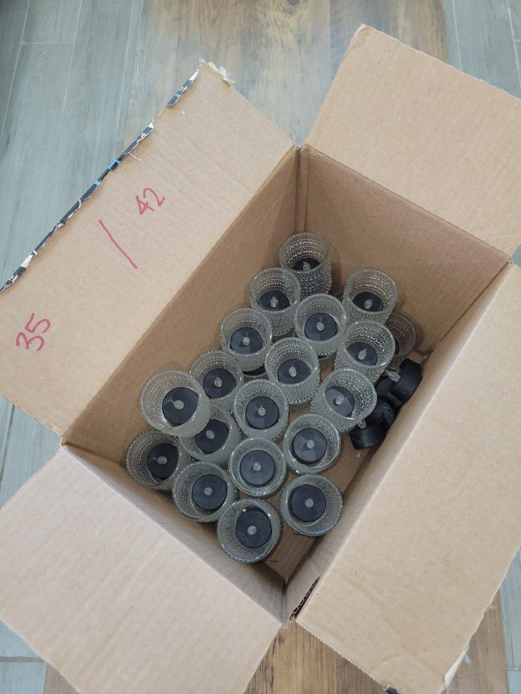 (35) Votive Glass Candle Holders (42) Blck Flameless Tea Lights Used 6hrs for wedding, all work.