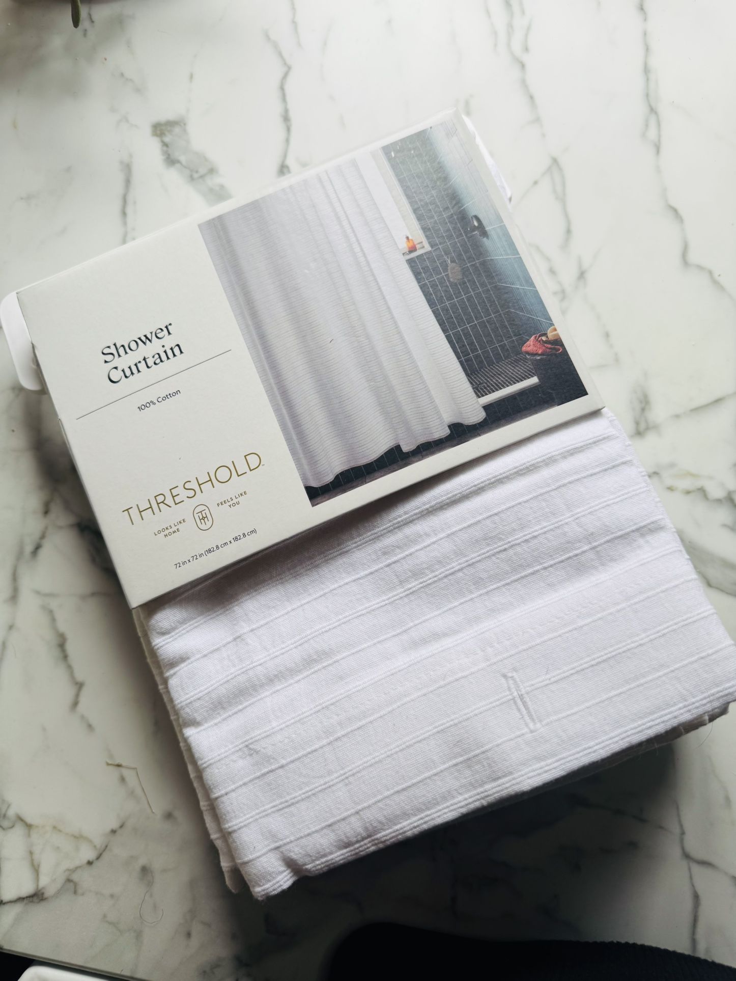 White cotton fabric with horizontal textured stripes. Standard top, 72 x 72 in. Brand new, never used.