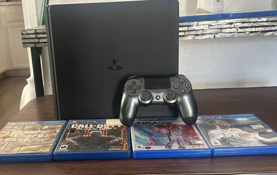 Hello I am selling my great condition ps4 slim 1tb With 4 disc games with all cords included controller pick up only