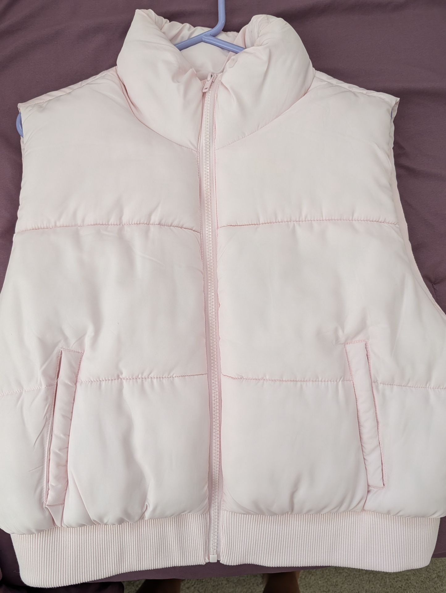 Madden Girl. Size large. Light pink cropped vest. Puffy. Barely worn. Good condition. Soft light pink puffer vest with front zipper. Two front hand pockets. Lightweight and cozy layering piece.