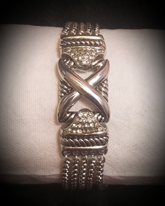 Silver center twisting cable detailed X Medallion Bracelet w/ Chain Strap. Gorgeous Style! Get the designer look without spending the high designer price! The center twisting cable and X medallion bracelet add a touch of elegance to the cable weave chain strap. Along with the cubic zirconias providing a dazzling sparkle. The magnetic closure makes it easy to put on and take off, while the security chains give you peace of mind that it will not fall off. Perfect for all occasions and styles, this piece of fashion jewelry is a must-have for any collection. The silver metal and cable chain type offer durability and quality. Add this gorgeous bracelet to your jewelry collection today! Silver Plated Cable Texture Metal / Silver Plated Wheat Cable Chain Strap / Magnetic Cable Texture Lock Metal Clasps with security chains New without tags - Has never been worn. Offers Welcomed!!