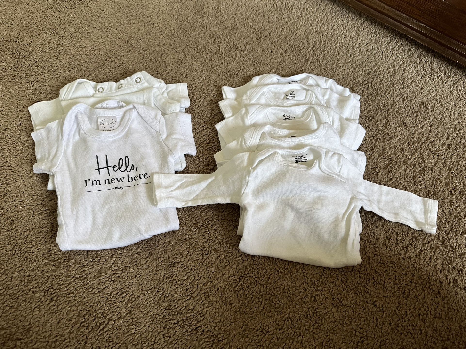 5 newborn onsies 4 shirt sleeve 1 long, printed onesie is 3-6 and additional 3 month onesie plain white.