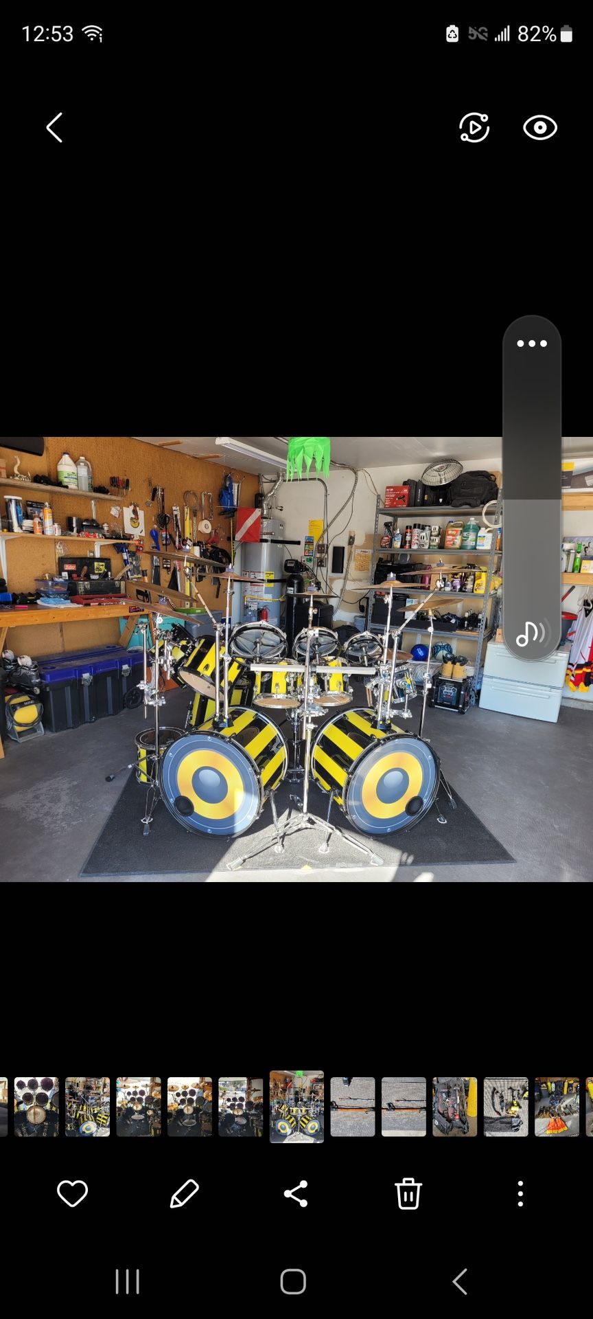 13 piece SP and pearl double bass drum set. Zildjian, paiste and Sabian cymbals. 10” splash Zildjian ZBT 14” Zildjian ZBT Hi-Hat, 16” rock crash Sabian ZBT 16” medium crash Paiste PST 5 16” China 18” China Zildjian 18” crash Zildjian ZBT 18” thin crash Paiste PST 5 20” Ride Zildjian ZBT 3 Roto Toms 5”x14” snare , 6”,8”,10” Roto toms, 8”,10”,12”,13”,14”,16” Tom’s. Have extra 10”, and 12” tom. 2- 22” Base drums + 7 pairs of drum sticks Vic Firth Extreme 5a 1 cow bell, 1 set of chimes 1 drum stick holders on floor tom 1 Zildjian Cymbal case