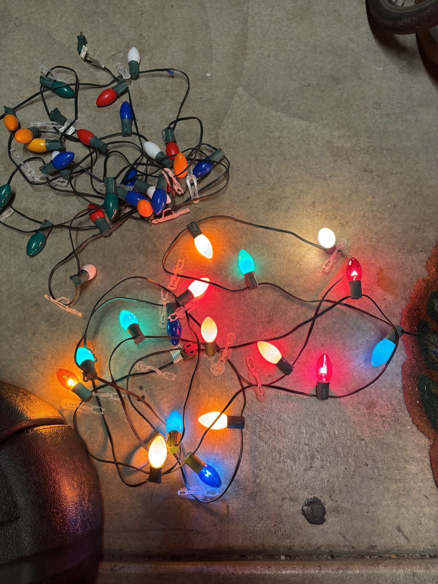These are used please see all photos. One strand has 4 bulbs missing but rest of lights still work. So you would need to purchase some bulb replacements. Location NW off Allen & Noriega