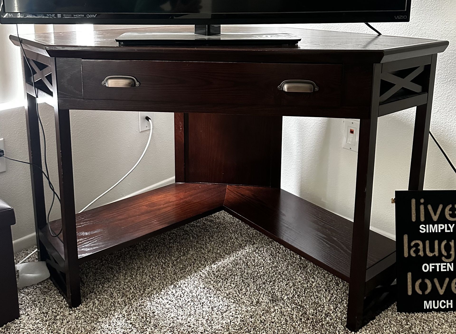 High quality sturdy corner desk, cherry wood. Some slight wear, but other wise in very good shape. Width: 4 ft Front to back: 2 ft Height: 2.5 ft