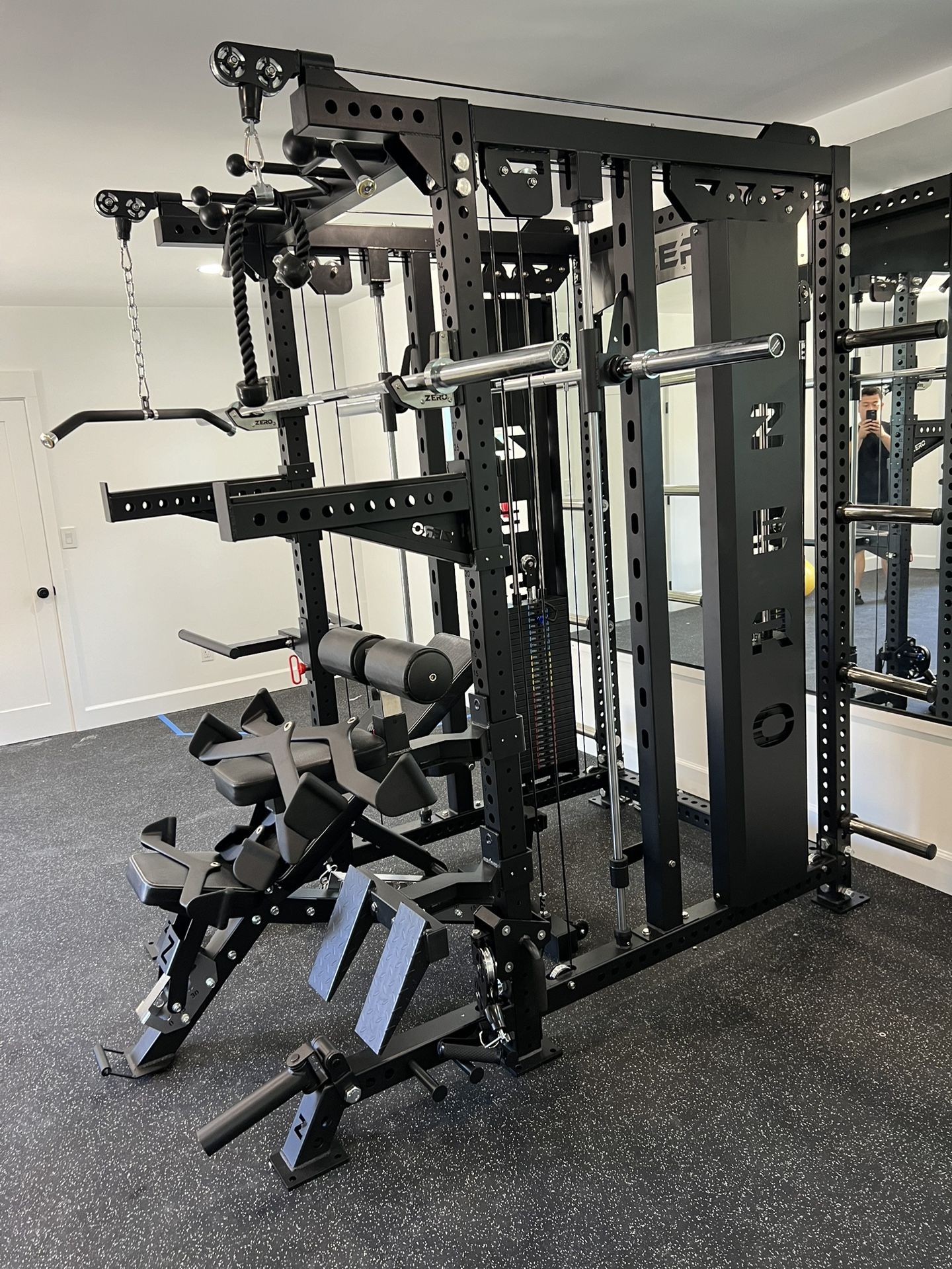 Zero SM500 Bundle Brand new and in the box! Free delivery and installation with full-price purchase. Cash, credit cards, and financing options available! LIFETIME WARRANTY The Zero Fitness SM500 is a versatile functional trainer featuring durable 3mm thick steel construction. It includes 300 lb. weight stacks on each side with both 1:1 and 2:1 pulley ratios for easy access to weights. The package comes with a 245 lb. cast iron weight set, a weight bench, and four pulleys for a variety of exercises. COMPETITION PACKAGE INCLUDES: Zero Fitness SM500 245 lb. weight set (pairs: 45 lb, 35 lb, 25 lb, 10 lb, 5 lb, 2.5 lb) 45 lb. Olympic barbell (1500 lb. rated) Weight bench (1000 lb. rated) All attachments included CONSTRUCTION: 11-gauge steel (3mm thick) Dimensions: L 49.2", W 49.2", H 92.5" Product weight: 1433 lb, fully loaded: 1928 lb FEATURES: 4-way functional trainer Two 300 lb. weight stacks High tensile cables Adjustable pull-up bar INCLUDED ATTACHMENTS: J-hooks, spotter arms, dip bars, lat pulldown seat, pull-up handles, and more. Explore various gym equipment including squat racks, power cages, benches, and dumbbells.