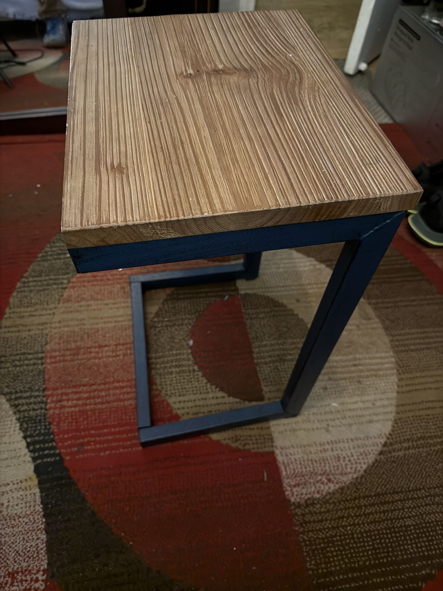 Modern sofa table features: - Very good used condition - No issues - Solid wood top measures 13”L x 10-1/4”W x 19”H x 5/8“D and sets atop a midnight blue 1-1/4”square hollow metal tube frame - Color: white oak - MSRP: $79