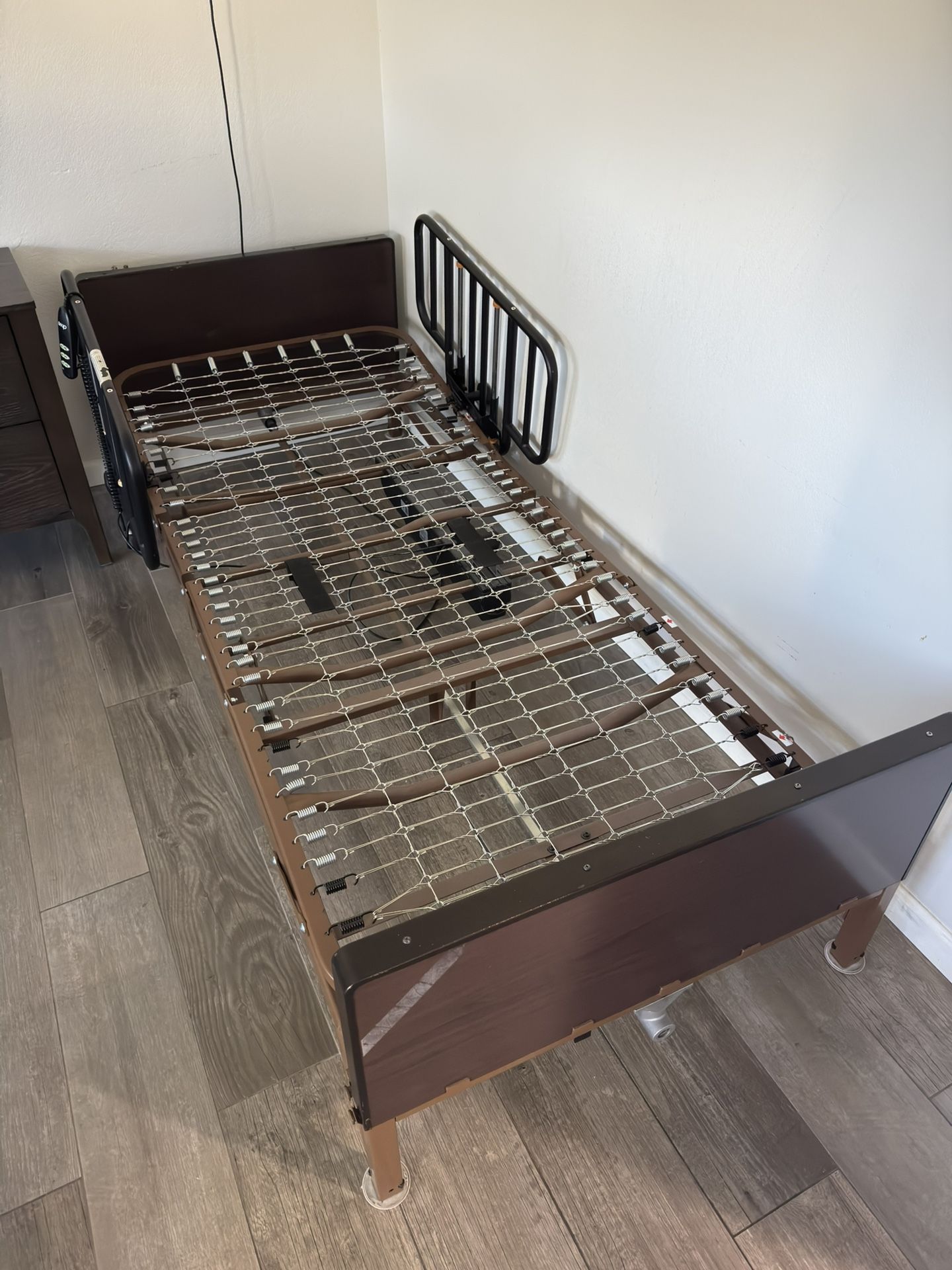 Adjustable twin bed frame with working remote. Head and foot sections move independently. Solid, sturdy frame. Everything functions properly. Mattress included for free if you want it