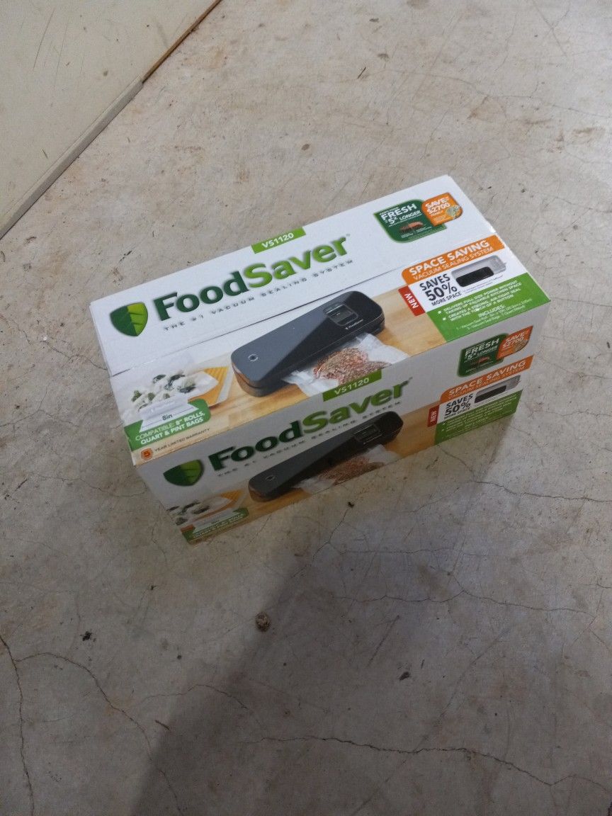Brand new Vs1120 Food saver The vacuum sealing system 5 yr limited warranty Save 50% more space More compact size 8" rolls are compatible Quart and pint size bags I ncludes Vacuum seal rolling x 10ft 5 Vacuum seal bag 1 quart size And compact Vacuum sealer