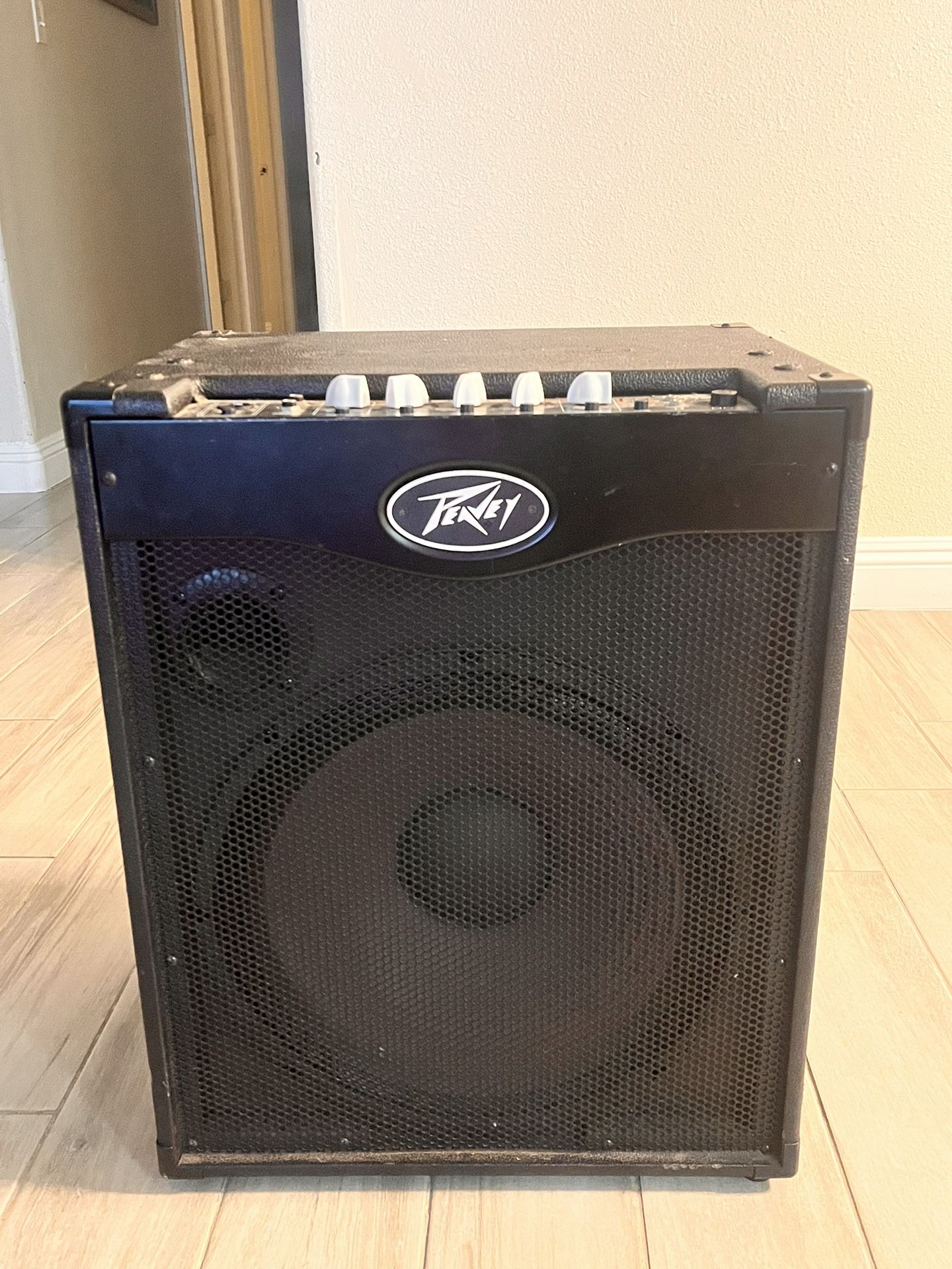 Peavey bass guitar amp. 1x15 75 watts. I DO LOOK AT TRADE OFFERS I’m a saxophone player if you have something that may interest me. Huge powerful sound. Plays great just too much for me at home. Handle is included One foot is broken off but I put a Lego piece underneath and it works perfectly fine.