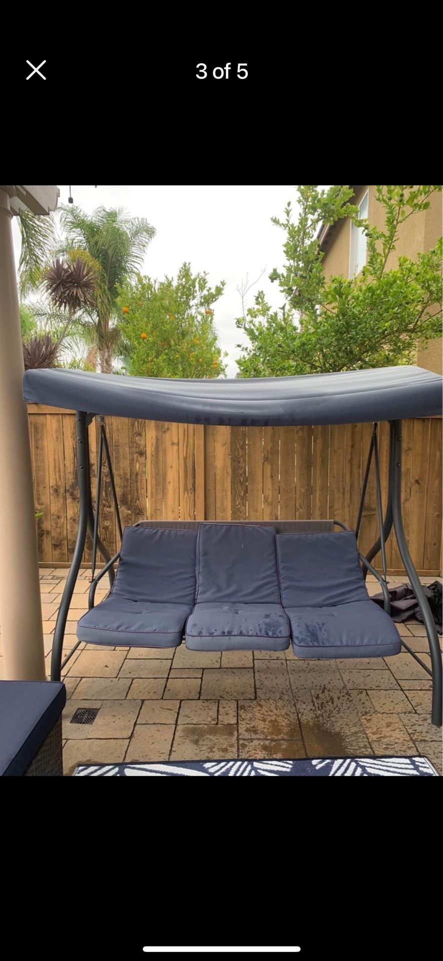 Navy blue patio swing, slightly weathered but cushions in excellent shape. Cover for weather protection included.