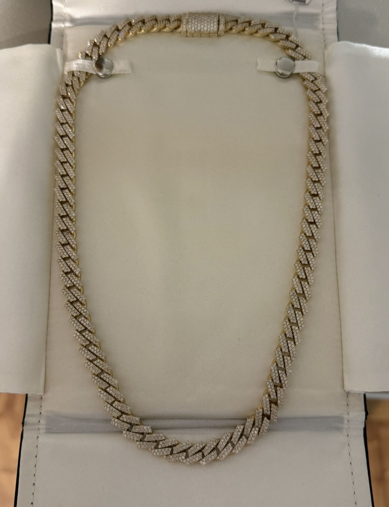Stunning 10k iced out bust down Diamond yellow gold Cuban link prong chain necklace * Metal Type: 10K Yellow Gold * Stone type: Diamonds * Diamond Carat Weight:18.77 * Diamond Count: 1824 * Width: 10mm * Gram Weight: 164.4 * Length: 22" Long • Diamond clarity H • Diamond color Si1-Si2 • Condition: Excellent Will be in Vegas until Tuesday night Cash only!! Can meet at a jeweler or a safe zone location