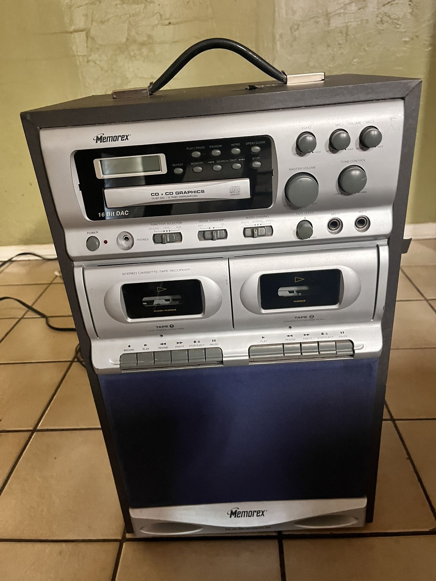 Memorex karaoke machine with CD player, two cassette players, two mics and wiring system from machine to TV. There are 22 various fun karaoke CDs available for $5.00 each.
