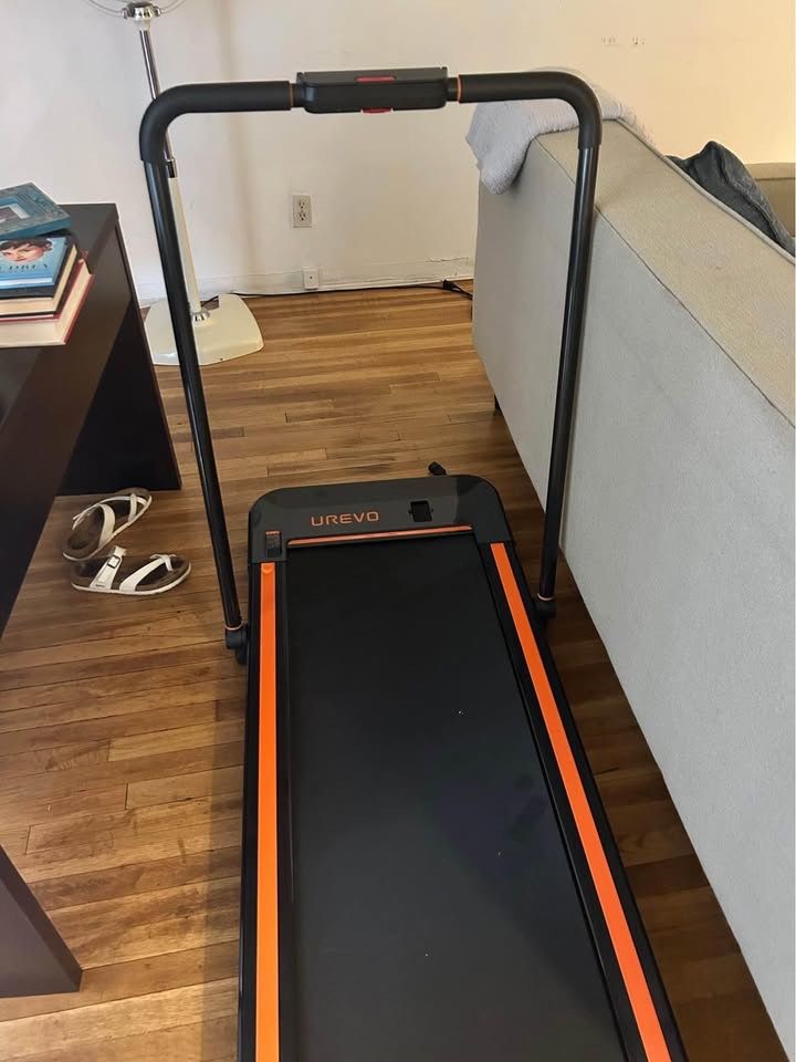 used it less than 50 times. *Must pick up in Los Feliz* Listed at $360 before tax on their website. Please see link to website for full specs: https://offerup.co/faYXKzQFnY?$deeplink_path=/redirect/ UREVO Strol Lite 2 in 1 Folding Treadmill: UREVO running machine is designed as a treadmill used for running fast as well as under desk walking machine, which is convenient to keep exercising during working. The LED Display & Remote Control: Make it easy for you to track speed, distance, time, and calories in real-time, and no need to switch the display manually during exercise. Using the remote controller to change the speed or stop the running machine. 2.5HP Powerful Motor: With a powerful 2.5HP motor offering a large load-bearing ability of up to 265 lbs. The sturdy running machine allows you to run up to 7.6MPH with frame up and walk up to 3.8MPH under the desk by the Remote Control. Non-assembly Design & Space Save Design: This 2 in 1 treadmill arrives fully assembled and can be used directly after unboxing. The foldable design and transportation wheels allow for easy mobility and a portable foldable treadmill for storage.