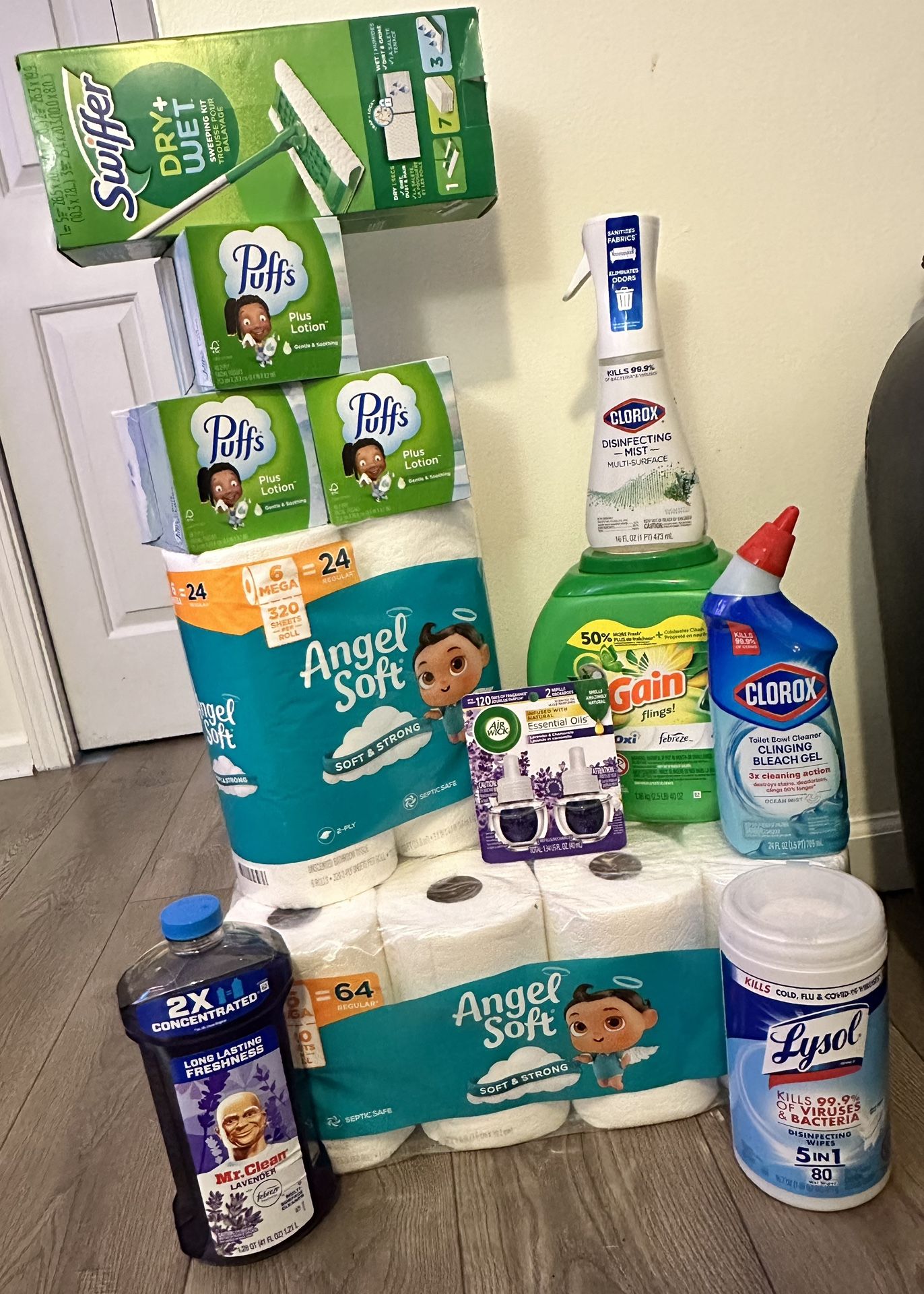 -16ct mega roll angel soft toilet paper -6ct mega roll angel soft toilet paper -Gain flings 60ct -Swiffer dry + Wet kit -Puffs 3 boxe of tissue -Mr. Clean 41oz multi surface cleaner lavender scented. -Lysol disinfectant wipes 80ct -Clorox disinfectant mist -Clorox toilet bowl cleaner -Air wick 2 refills lavender scented oils