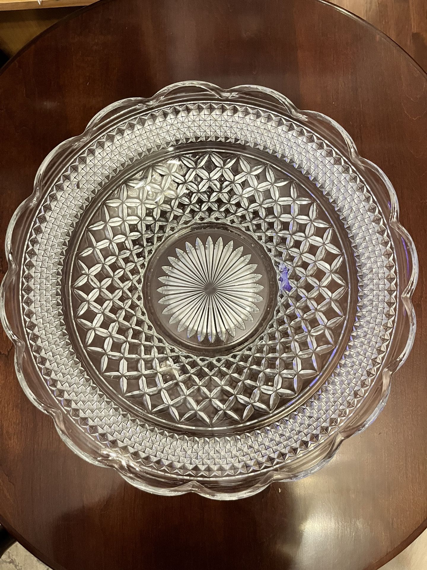Vintage Anchor Hocking "Wexford" pattern Large 14” Serving Bowl/Platter Has diamond and criss-cross design with a scalloped or cupped edge. In excellent condition No chips or cracks Pick up in Redlands