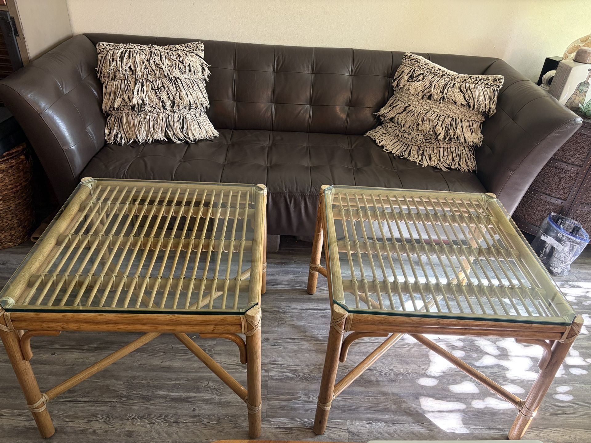 Excellent condition. Quality pieces! Each side/end table measures 25” square by 22 inches tall.