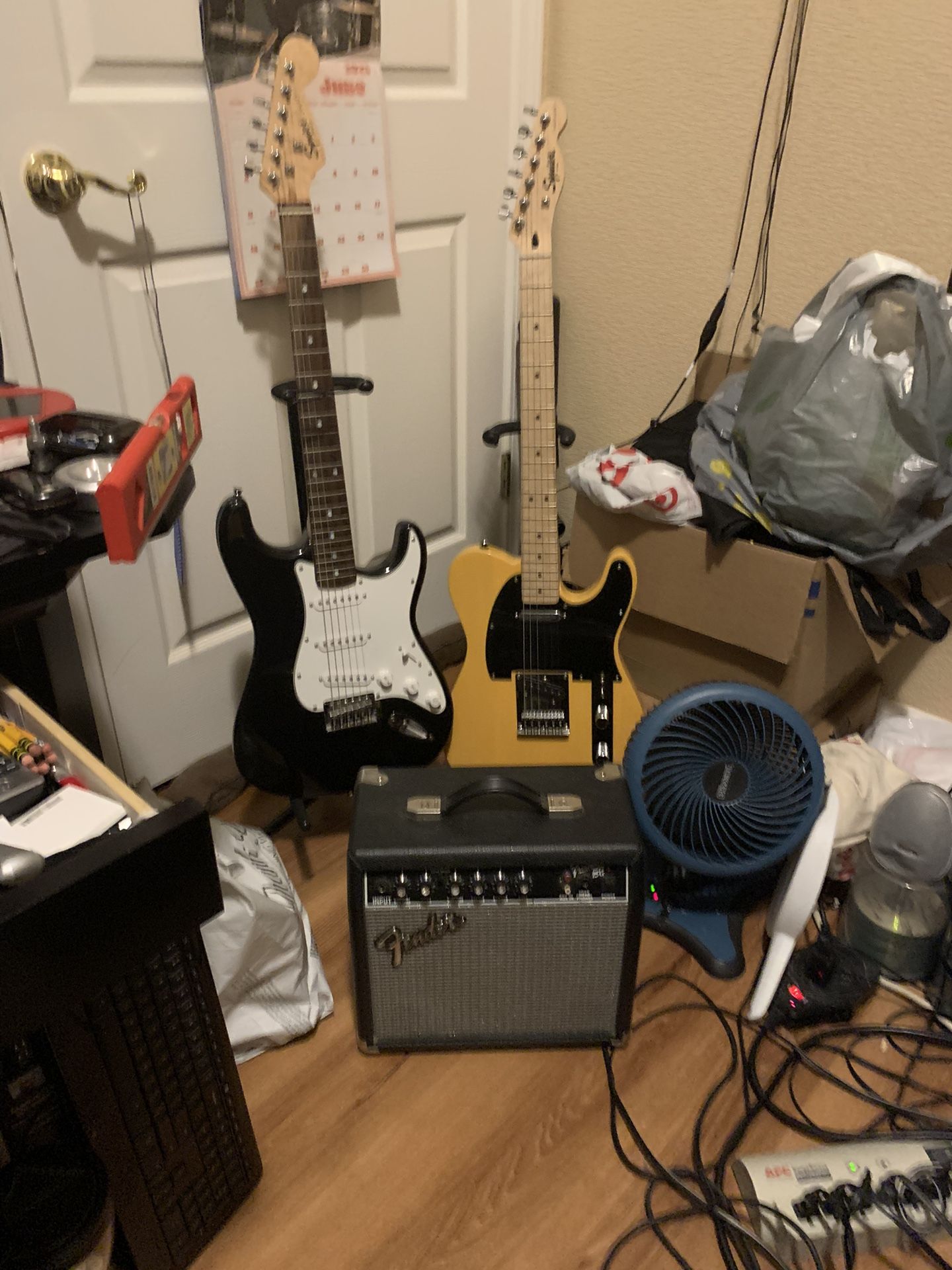 A Squire Strat, and a Squire Telecaster, both in mint condition. Both sound great. Both play well also. I’m including a Fender Amp! A Frontman 15G! This amp really puts out for its size. Asking $200.00 for the Strat guitar, What I paid for it! $300.00 for the Telecaster , again what I paid for it! Both guitar’s have new strings. I’m looking to upgrade to a Gibson Les Paul. I’ve been playing guitar since I was about 10. There is nothing greater that you can do for your child than to teach them to learn and love music! They will be eternally grateful!