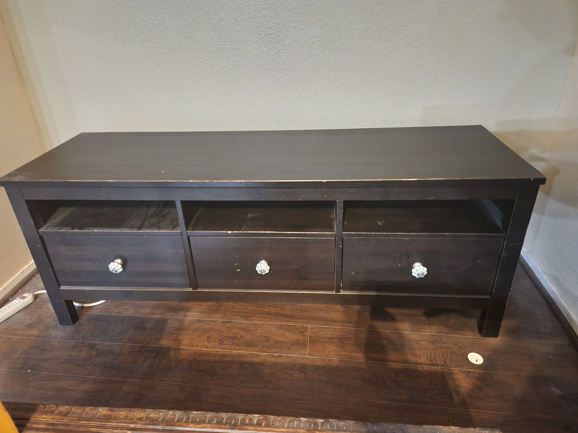 Spacious dark brown TV stand. Has three drawers and three open shelves for storage. Great for your living room or entertainment area. Measures roughly about 59 inches long and 23 inches tall.
