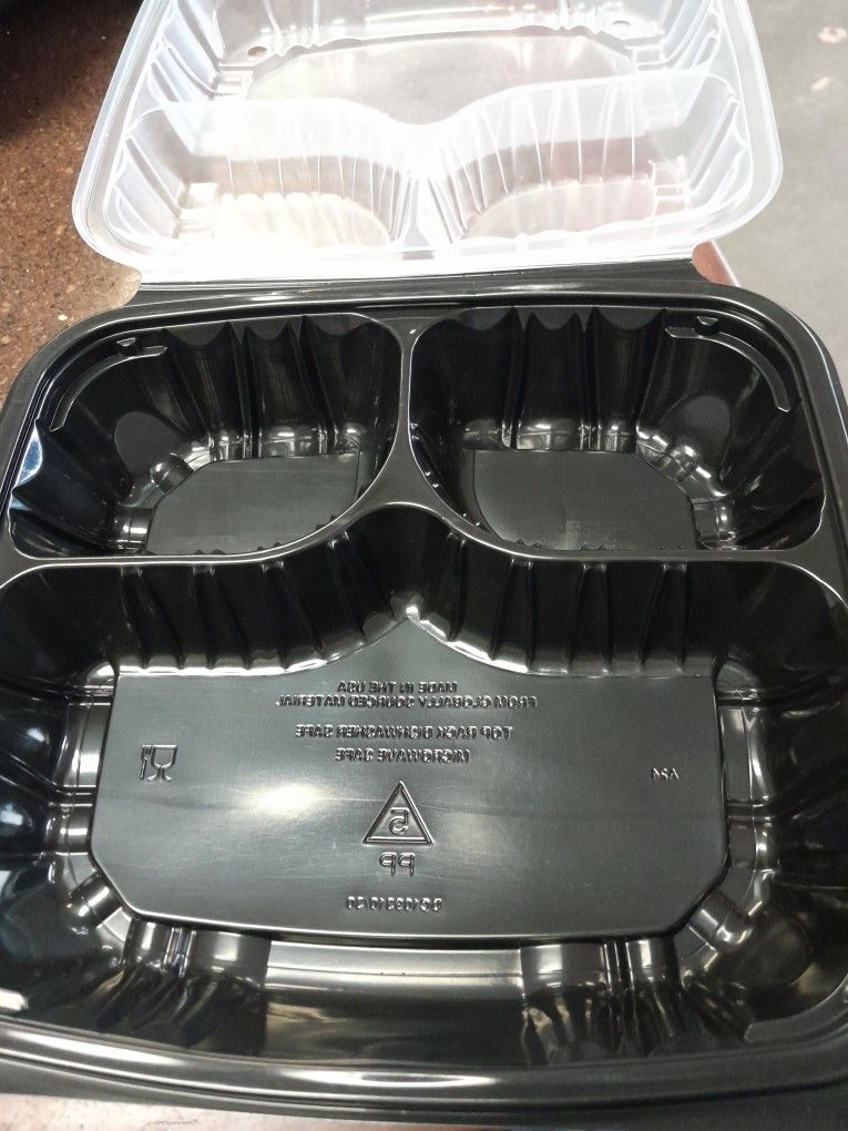 Heavy duty 3 compartment food containers. 65 count per pack. Black bottom clear top. Brand new. $25.00 OBO