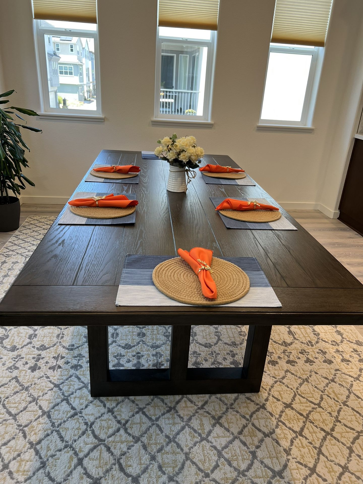 Are you looking for a good quality wooden dining table that comfortably sits 6 people? Look no further! And if you decide to purchase this, we will throw in the area rug seen underneath the table for FREE!!!