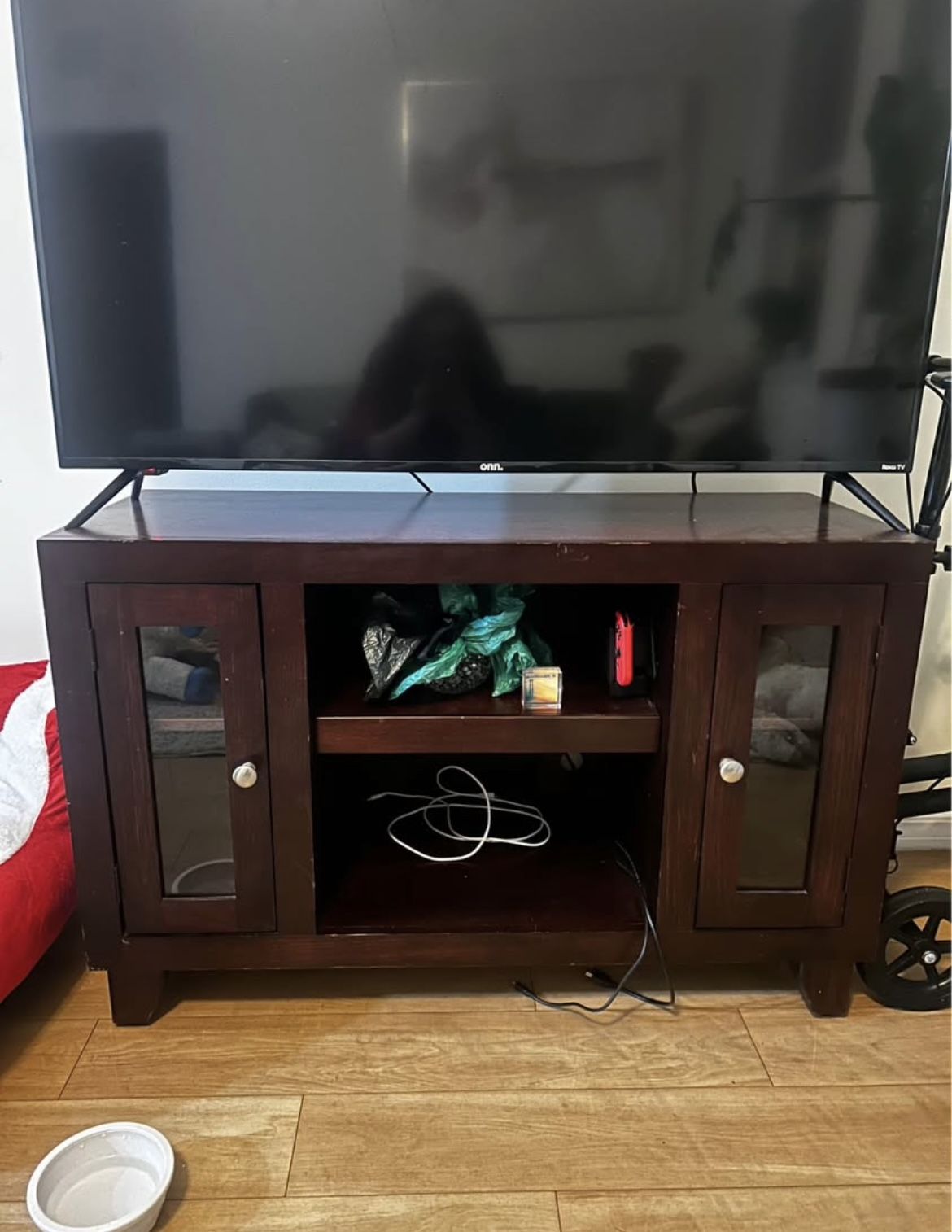 Has some wear and tear, had for a few years but otherwise good condition holes in back to hide cords