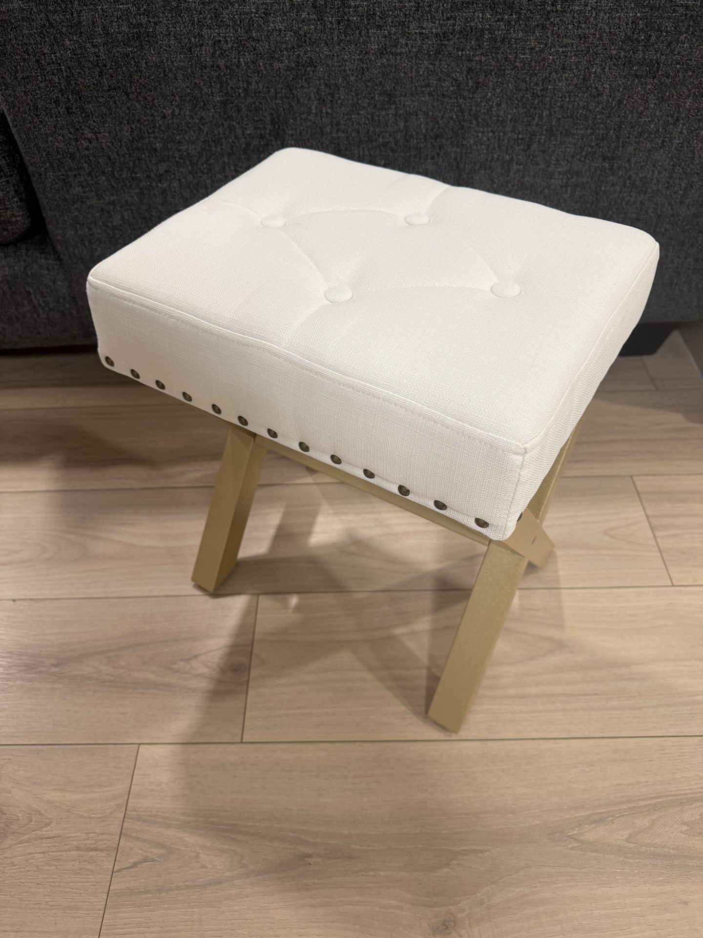 Modern Square Foot Stool Ottoman, Upholstered Vanity Chair with Metal X-Legs & Soft Linen Fabric - Versatile Seat and Footrest for Makeup, Living Room, Bedroom & Entryway(X-Gold-White)