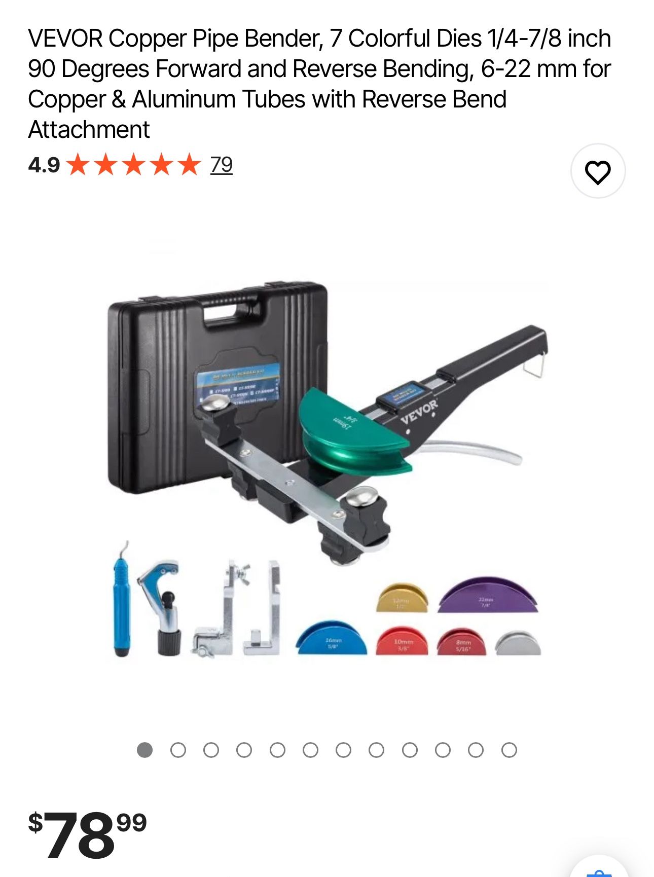 VEVOR Copper Pipe Bender, 7 Colorful Dies 1/4-7/8 inch 90 Degrees Forward and Reverse Bending, 6-22 mm for Copper & Aluminum Tubes with Reverse Bend Attachment