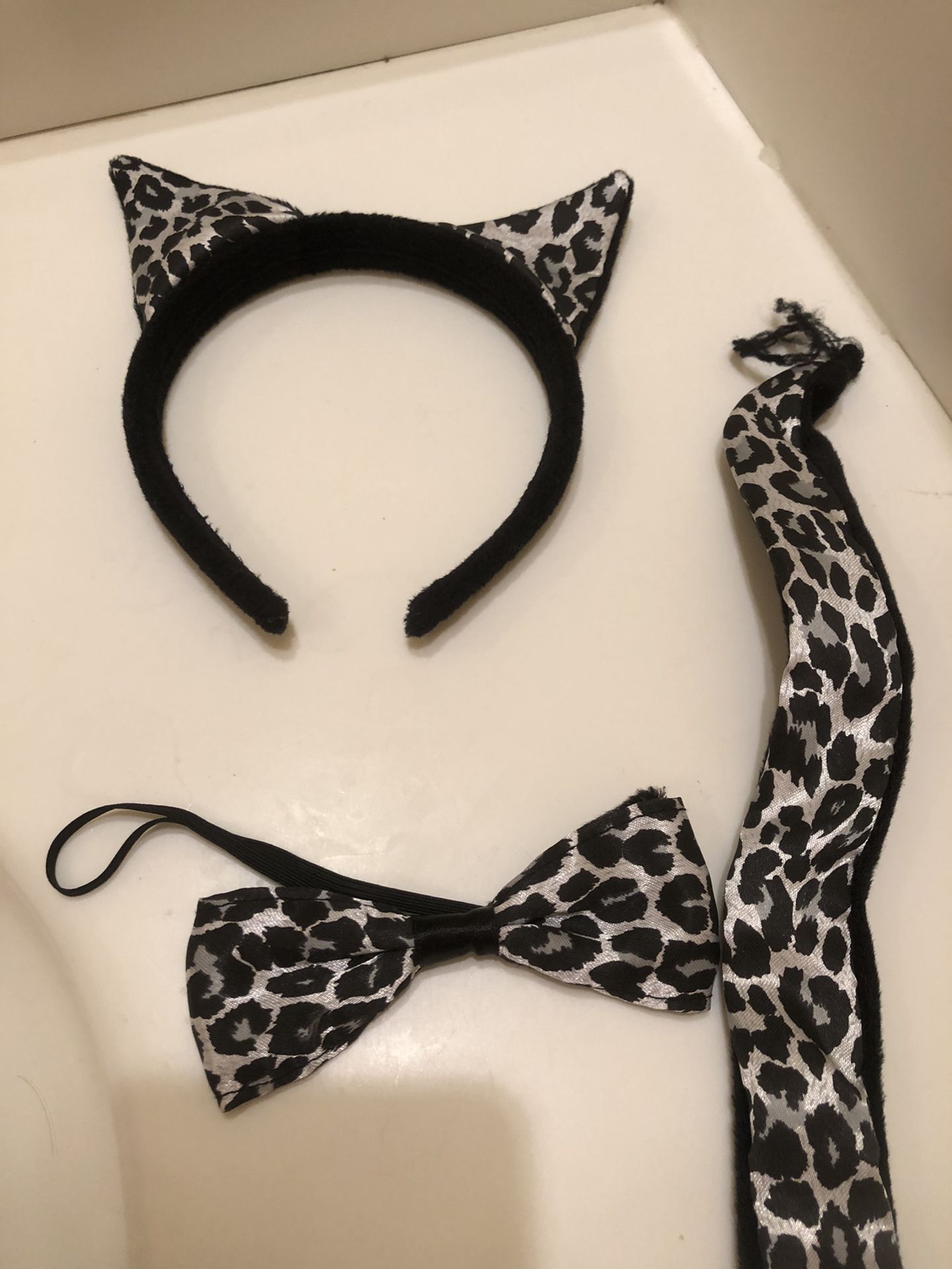 Lot of 3 Cat / Animal Ears, 1 Bowtie and 1 Tail as Pictured and As is. Not sure how tail attaches as it appears a piece is missing, so perhaps it can be pinned. Previously Owned.