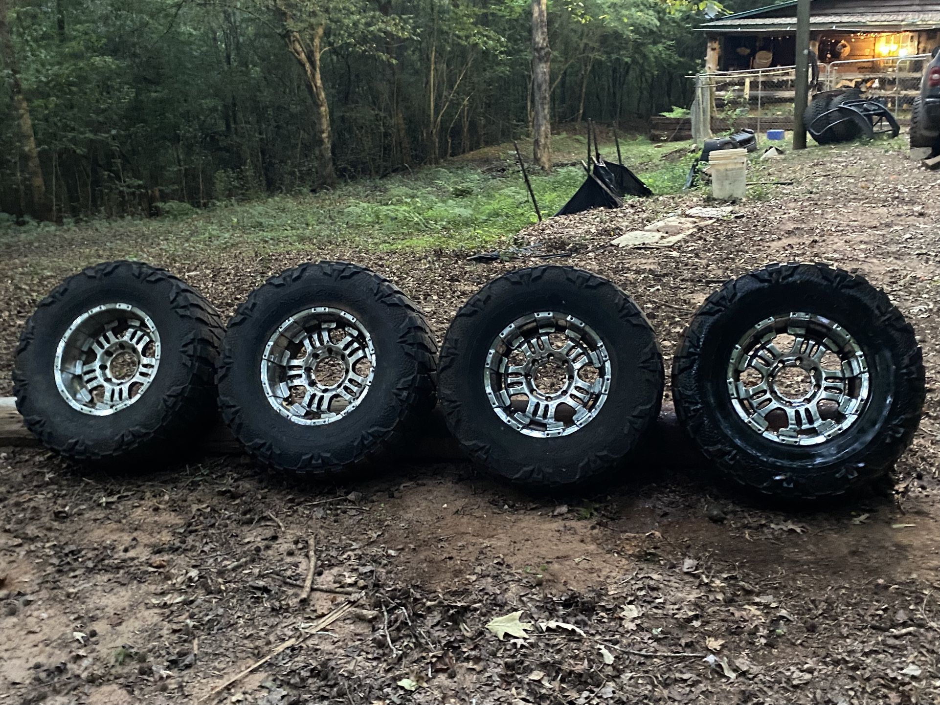 Set of aftermarket wheels and 37x13.50R18LT Nitto grappler tires off of F350. 2 tires have decent tread and 2 are slick as a baby’s ass and all 4 hold air. Have some lug nuts but do not have the key for them. No center caps. $450. NO TRADES. If listing is up i still have them. No holds first come first serve.