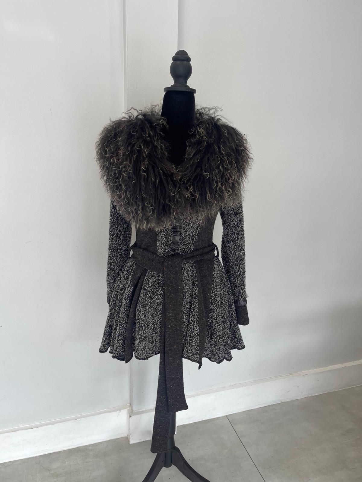 Statement Piece: A dramatic and luxurious coat, perfect for making an entrance in the colder months. The silhouette is defined by a structured waist, a long belt, and a voluminous peplum skirt. • Real Fur Feature: The absolute highlight is the oversized, fluffy collar made of Real Lamb Fur, providing superior warmth and a high-end texture. • Flattering Fit: The belted, peplum style cinches the waist, creating a beautiful and feminine shape. • Fabric: The body is a cozy wool-blend knit, making it comfortable and warm for autumn and winter. #RealFur #LambFur #WoolBlend #PeplumCoat #FurCollar #LuxuryCoat #DesignerUnknown #StatementCoat #WinterCoat #BeltedCoat #obo