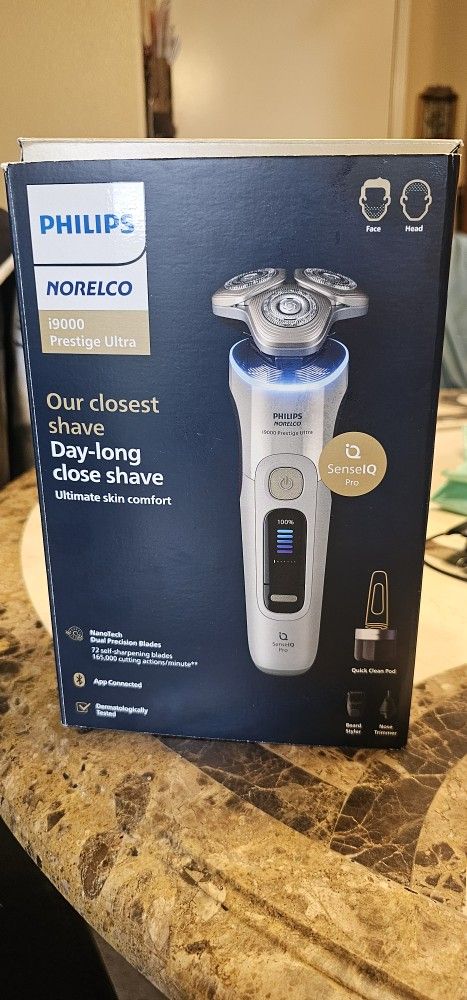 Open box brand new. Philips Norelco Shaver i9000 Prestige Ultra, Wet & Dry Electric Shaver, White Gold, SenseIQ Pro Technology, Triple Lift & Cut System, 360 Rotating NanoTech Precision Blades, Beard Styler,