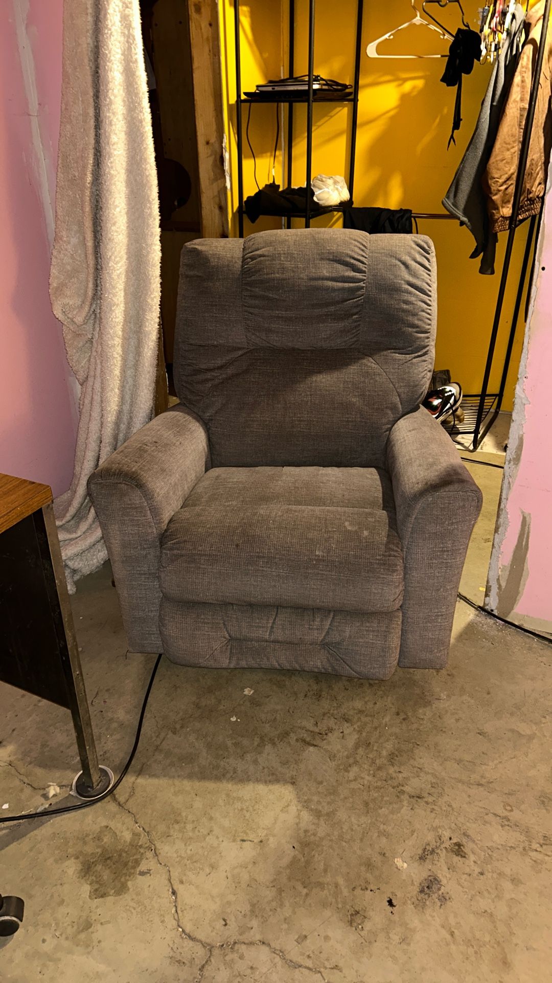 Two identical recliners in complete working order, but some stains are visible. Gray-blue color. I’m only getting rid of them because we are moving. $20/each or $30 for both of them.