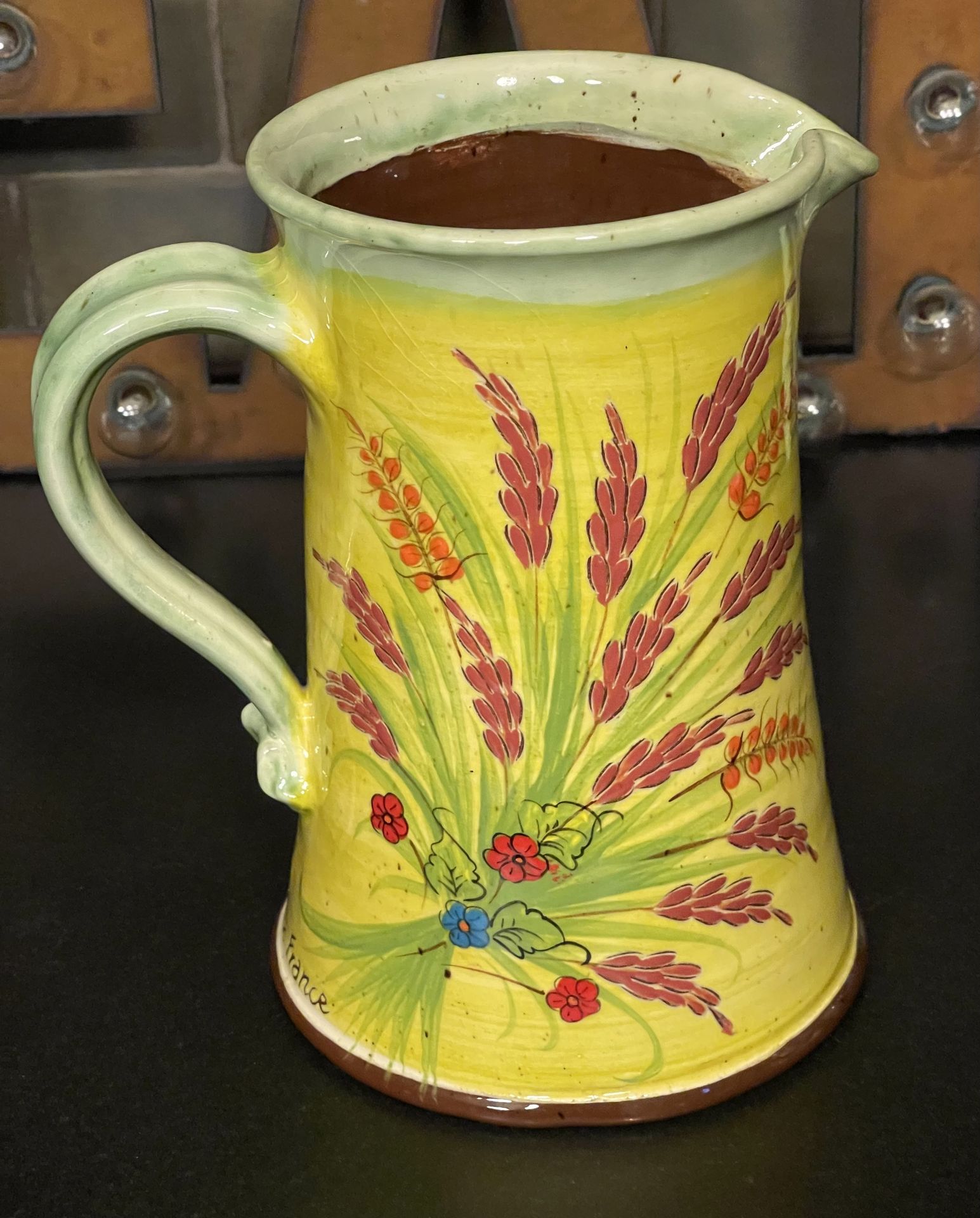 A lovely vibrant yellow color, with grasses and tiny red and blue flowers on both sides of the pitcher. Height - 8.5”. Diameter at base: 6”. Diameter at top: 4.75”. A beautiful piece - for serving drinks, or to use as a vase.