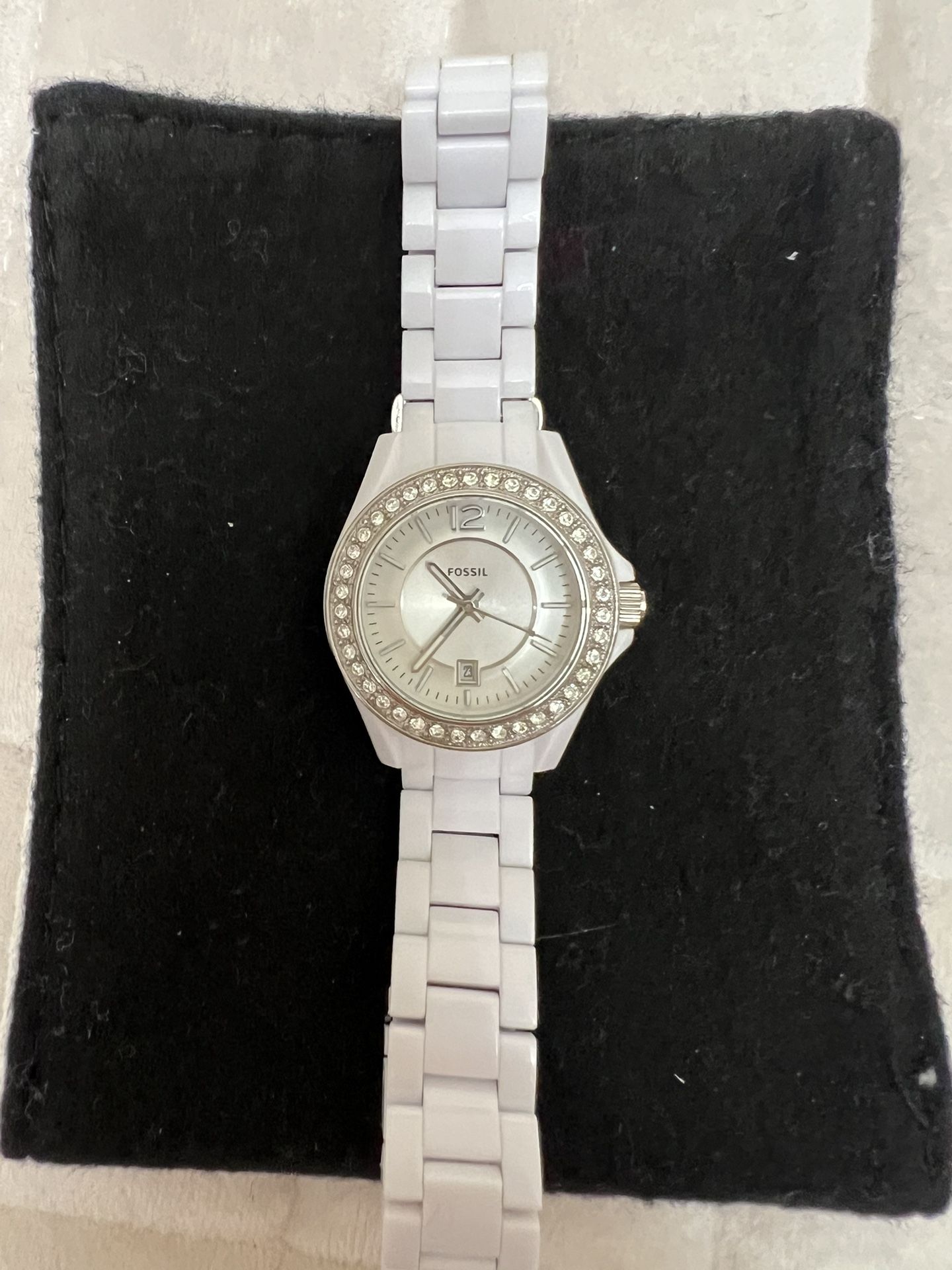 Super great condition - like new. Dial: Silver and white, round sleek stainless steel/plastic case with a silver dial and glitz accents. Watch Band: White, lightweight and durable plastic band with a secure fold-over clasp closure; links can be removed for a customized fit Needs new batteries (not supplied)
