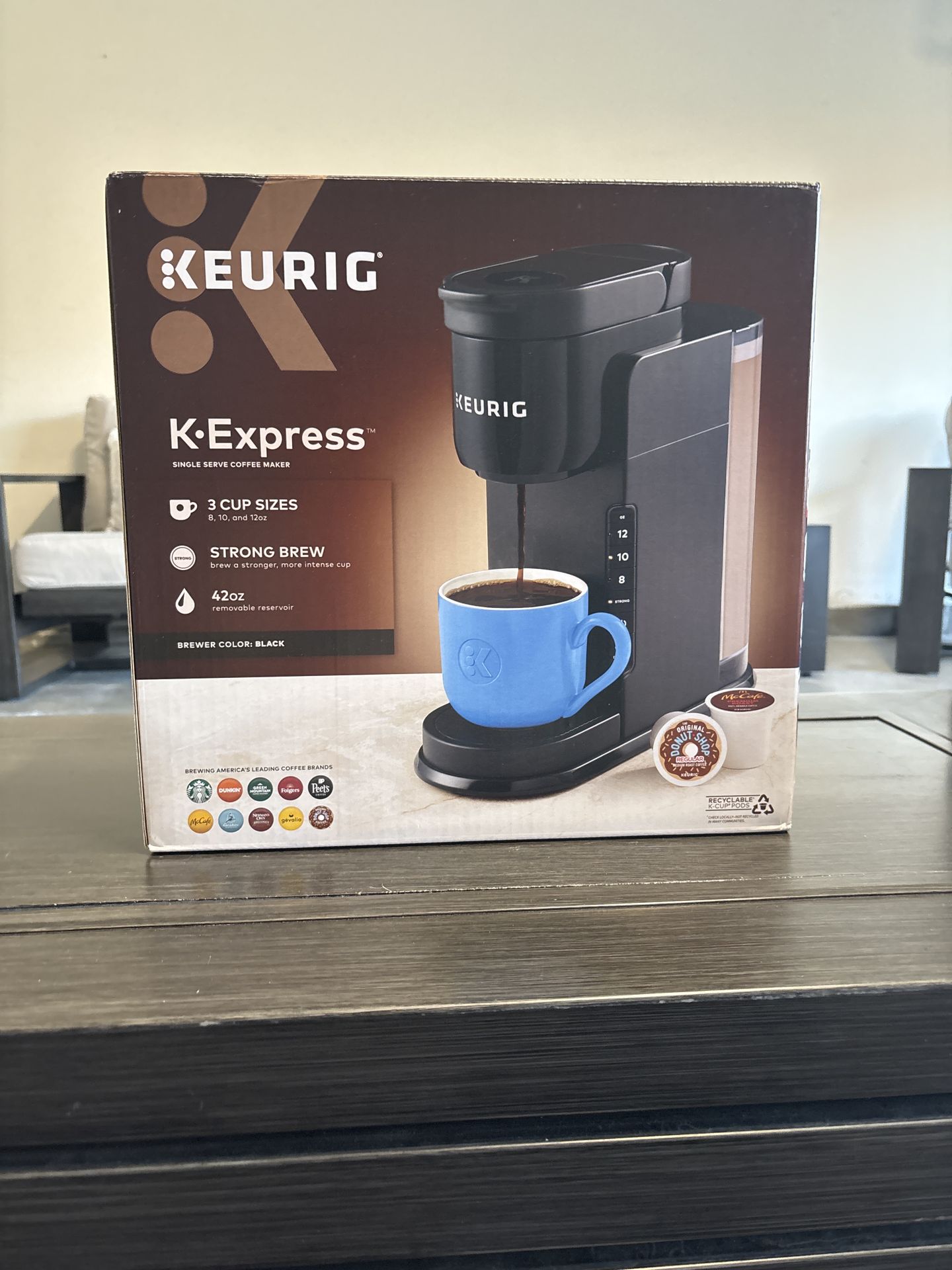 Brand new Keurig K-Express coffee maker with 3 cup sizes (8, 10, 12 oz), strong brew for bolder flavor, and a 42oz removable water reservoir. Fast, compact, and works with K-Cup pods. Unused, box in perfect condition.
