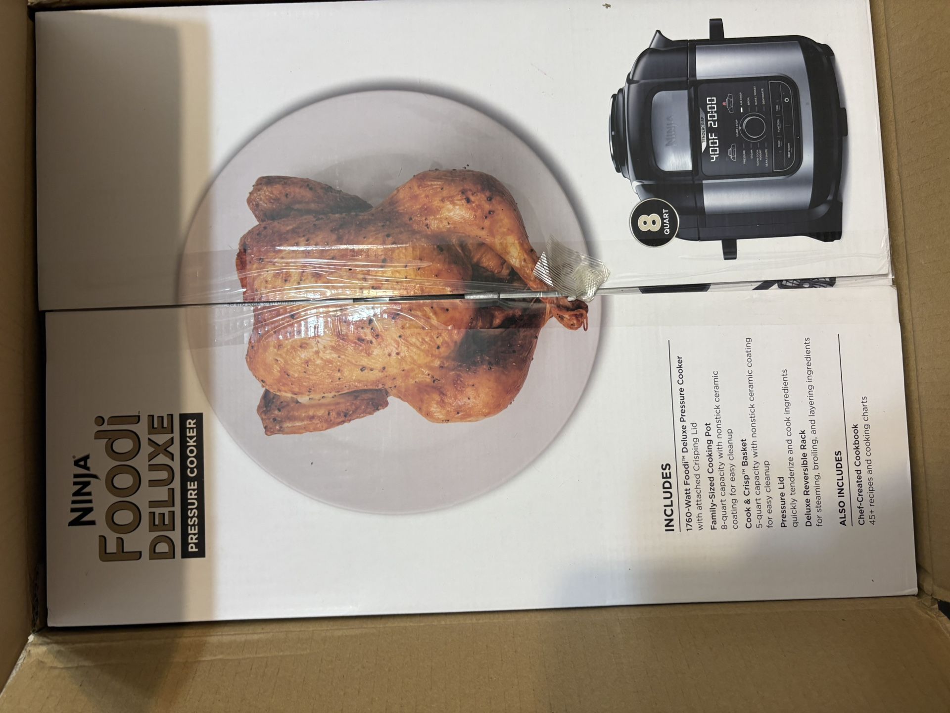 New in box- never opened. Purchased for $225 Deluxe Cooking Capacity - XL 8-Qt. Pot, XL 5-Qt. Cook and Crisp™ Basket and Deluxe Reversible Rack Let You Cook for a Small Group TenderCrisp™ Technology Lets You Quickly Pressure Cook Ingredients to Lock in Juices, When Give Them a Crispy, Golden Air-Fryer Finish Deluxe Reversible Rack Lets You Steam and Broil, As Well As TenderCrisp™ Up To 8 Chicken Breasts at Once or Add Servings to Layered 360 Meals XL 8-Qt. Ceramic-Coated Pot: Nonstick, PTFE/PFOA Free, And Easy to Hand-Wash XL 5-Qt. Cook and Crisp™ Basket: Large-Capacity, Ceramic-Coated, PTFE/PFOA-Free Nonstick Basket Is Dishwasher Safe and Holds Up to A 7-Lb. Chicken 9 Functions: Pressure Cook, Air Fry/Air Crisp, Steam, Slow Cook, Yogurt, Sear/Sauté, Bake/Roast, Broil, Dehydrate