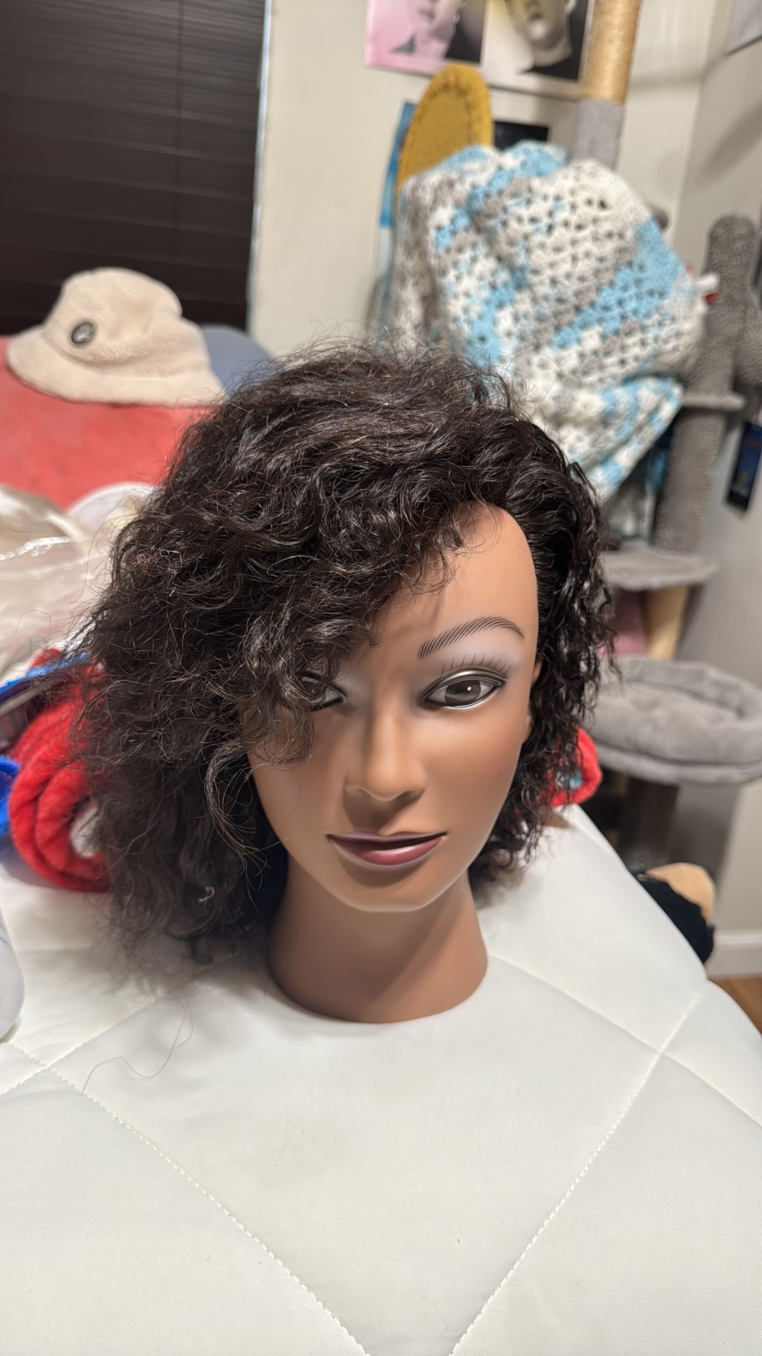 Cosmetology head to practice for school or work this head is an example of curly hair.