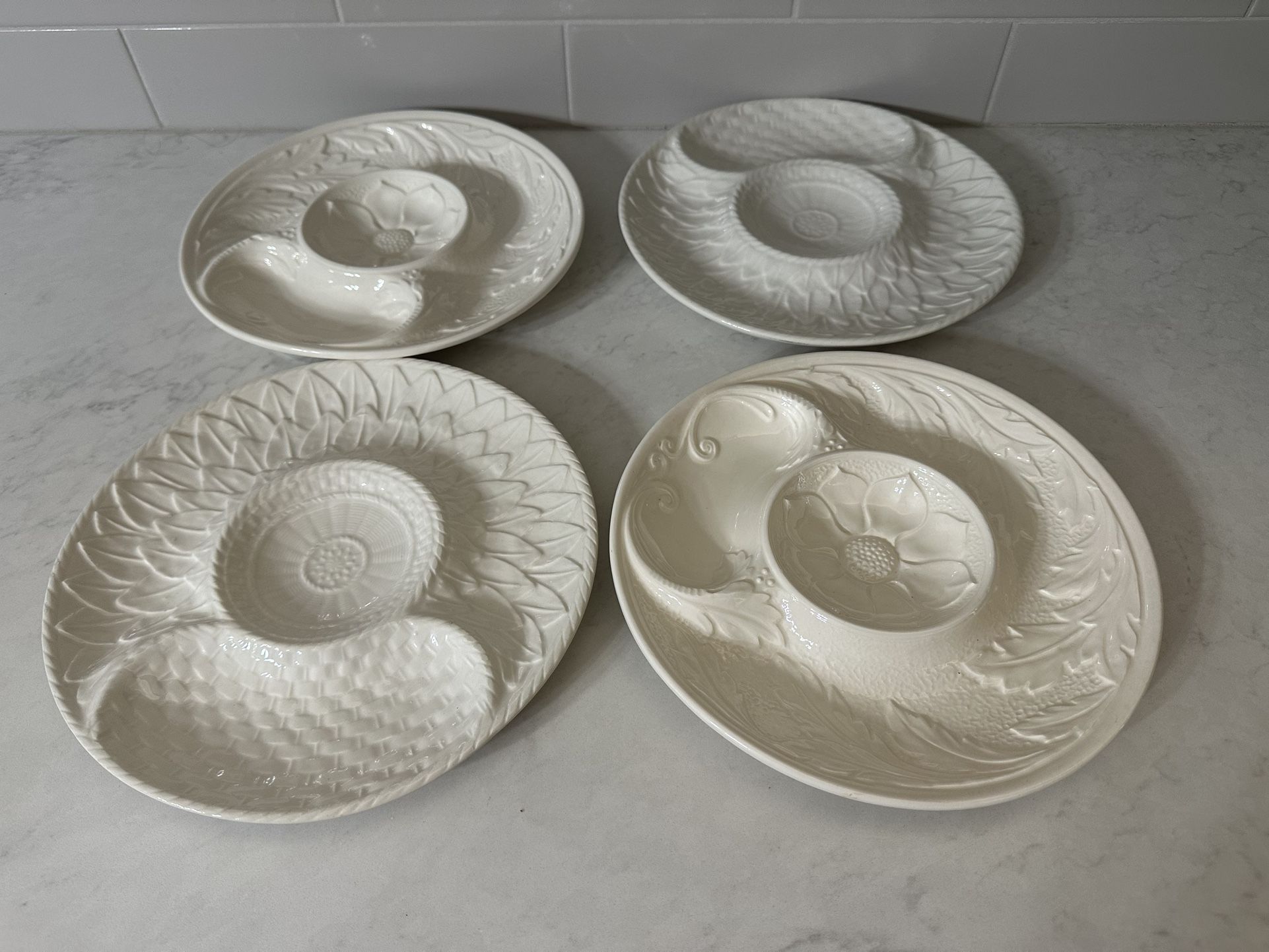 Excellent condition, no chips, cracks or damage. 2 different designs. 2 plates have a sun burst pattern and 2 have a sunflower pattern. Diameter of each plate is 9 7/8”. These beautiful plates would make a welcome addition to your holiday table.