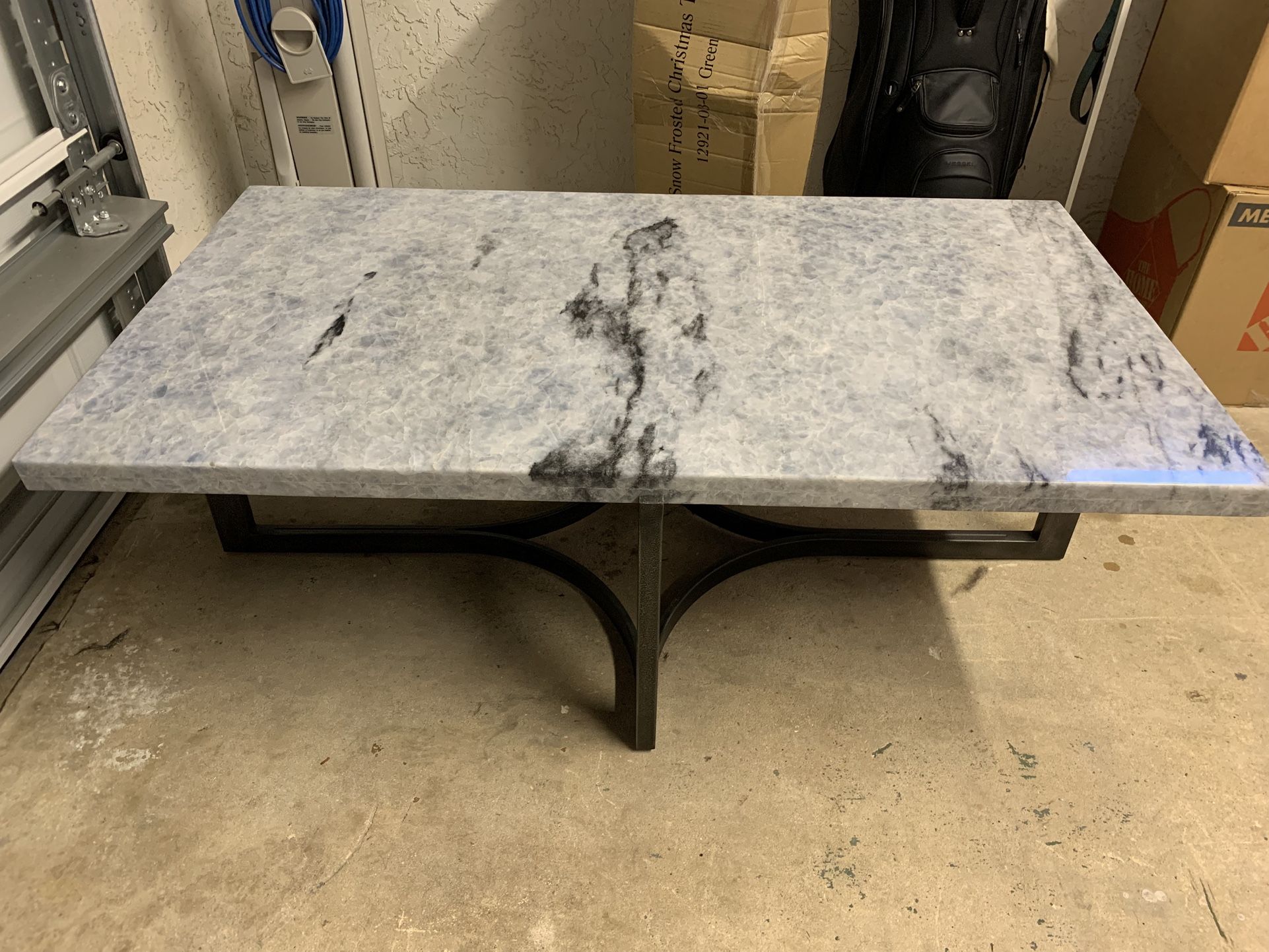 Discontinued by manufacturer 6/2/21. Worked in my apartment, doesn’t fit the decor of my house. Small chip on side where the marble slab meets the base - see picture - I siliconed it back into place and is barely noticeable, besides that it’s in perfect condition. WEIGHS A TON, please consider that when arranging pick up. I’ll help load it into your vehicle. Dimensions: Width 51" (129.5 cm) Depth 29" (73.7 cm) Height 17" (43.2 cm) Construction & Ergonomics: Construction Metal Base In Textured Grey finish. Tropical Grey and White Stone. The Visby Cocktail Table features a rectangular stock metal base with a shaped diamond stretcher in a textured grey finish with a captured 1 1/2" thick grey and white Tropical marble top. The table has been sized for today's lower seating sofa frame styles.