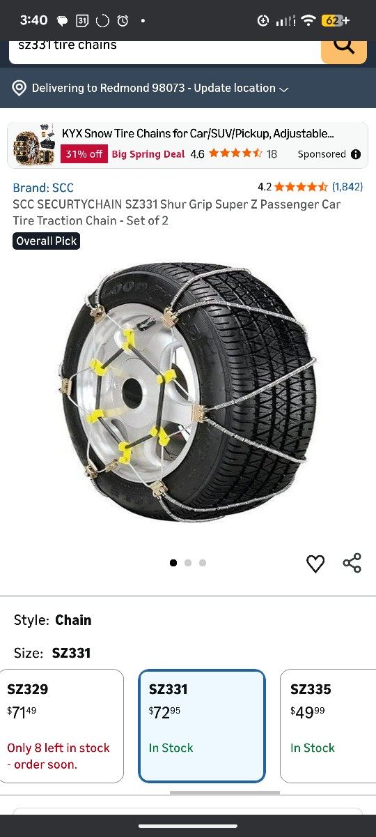 Snow Tire Chains - Super Z - Opened, but never used once on the road as it was not needed - Originally bought for over $73 - SZ331 size https://offerup.co/faYXKzQFnY?$deeplink_path=/redirect/: SCC SECURTYCHAIN SZ331 Shur Grip Super Z Passenger Car Tire Traction Chain - Set of 2 : Automotive https://offerup.co/faYXKzQFnY?$deeplink_path=/redirect/ - Shur Grip Z class S cable chains - Fast and easy installation with included rubber tighteners - For use on most passenger vehicles - Construction- alloy cross member Serious inquiries only please NO TRADE CASH ONLY PLEASE