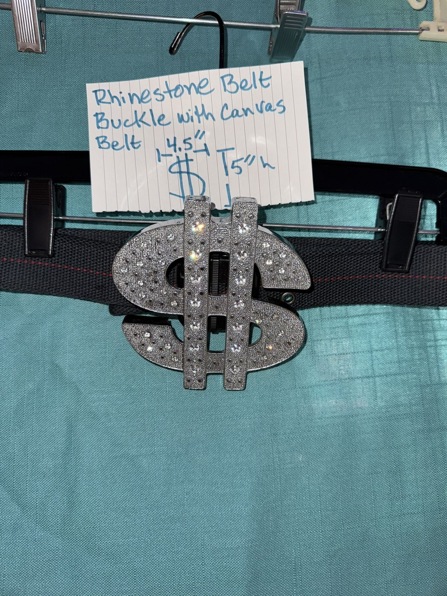 Cool silver bling bling, rhinestone belt. The buckle is real metal with real glass gemstone rhinestones. Buckle measures 4” x 4.75” (just under 5”) ✌🏽No gems 💎 missing. Dollar symbol 💲 fun for Halloween 🎃 New Year’s Eve, cosplay, fun dress up, or party scene… It’s on a dark blue canvas web belt. Can probably switch to any size belt the way it’s attached. Photo doesn’t do justice taken at night with flash. It’s a muted silver metal but looks flashy. Cool 😂OK to make offer. 👌🏽
