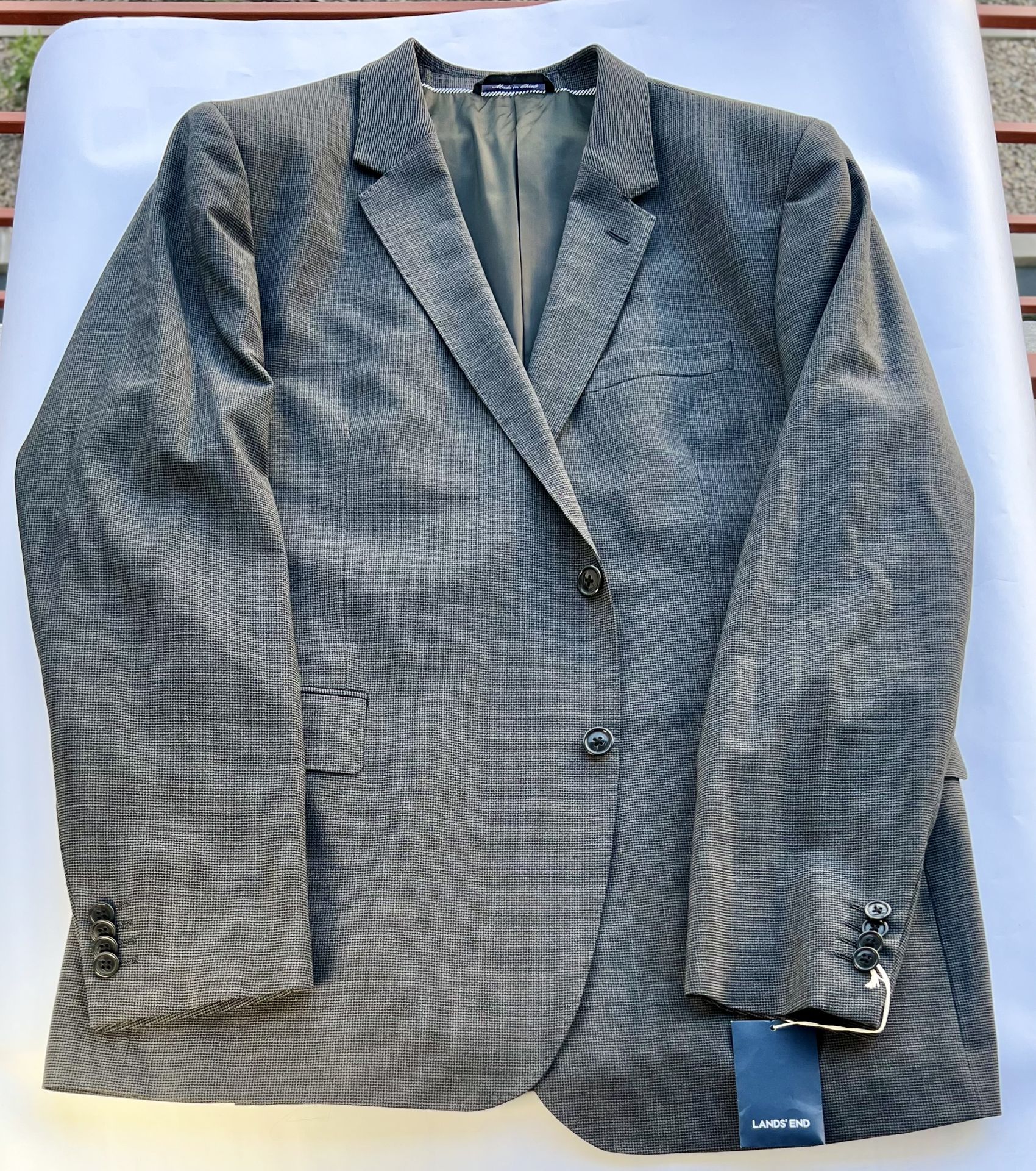 Brand new Lands’ End men’s blazer / sport coat, size 46 Regular, Tailored Fit. Never worn, never used. Clean and in excellent new condition. Classic gray micro-houndstooth pattern with a sharp, versatile look that works well for business, smart casual, church, dinners, events, or office wear. Details: Brand: Lands’ End Size: 46R Tailored Fit Two-button front Fully lined Side vents Classic notch lapel New condition / never worn This blazer looks polished and timeless, easy to pair with dress pants, chinos, or dark jeans.