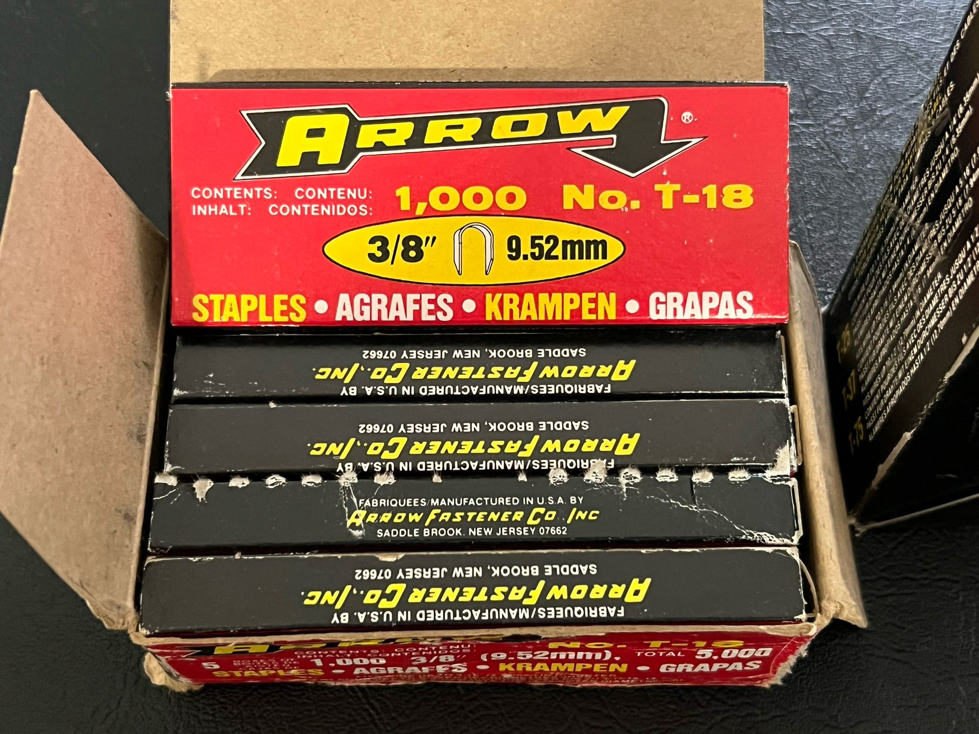 ARROW BRAND T18 STAPLES. 10 BOXES OF 1000 EACH FOR A TOTAL OF APPROXIMATELY 10,000 STAPLES. NEW $25.00.